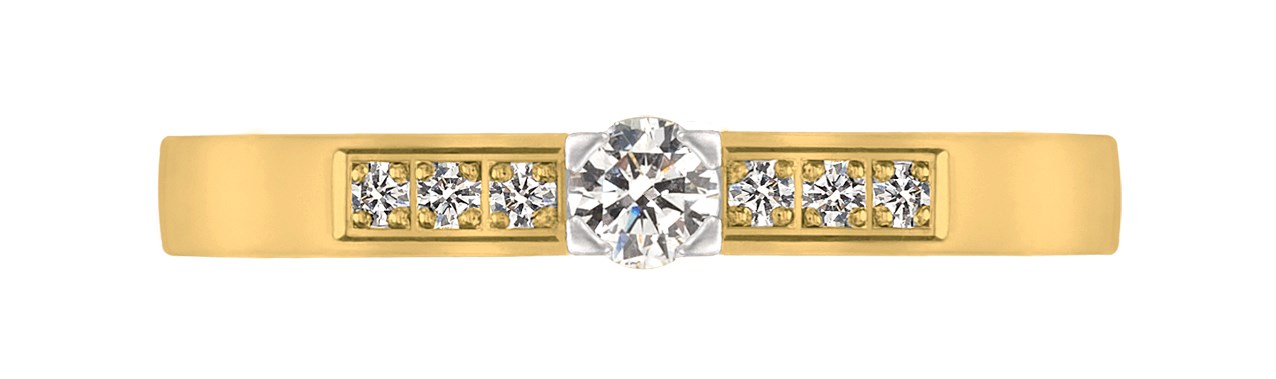 14k geelgouden ring, van het merk Aller Spanninga, met 7 diamanten. De midden steen is 0.07crt, gezet in een witgouden chaten met vier zetpoten. De 6 zijstenen zijn elk 0.01crt.