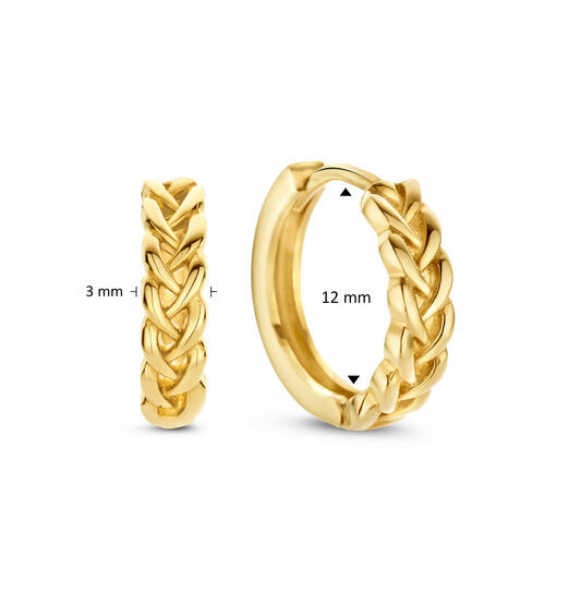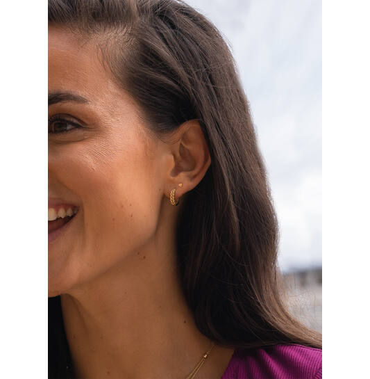 Verbintenis alom met deze 14K gouden Petit Sablon gevlochten klapoorringen met een doorsnee van 7mm. Een verfijnde ronde oorring die perfect aan het oor sluit. Goed te combineren met de andere sieraden van Jackie voor een trendy look!