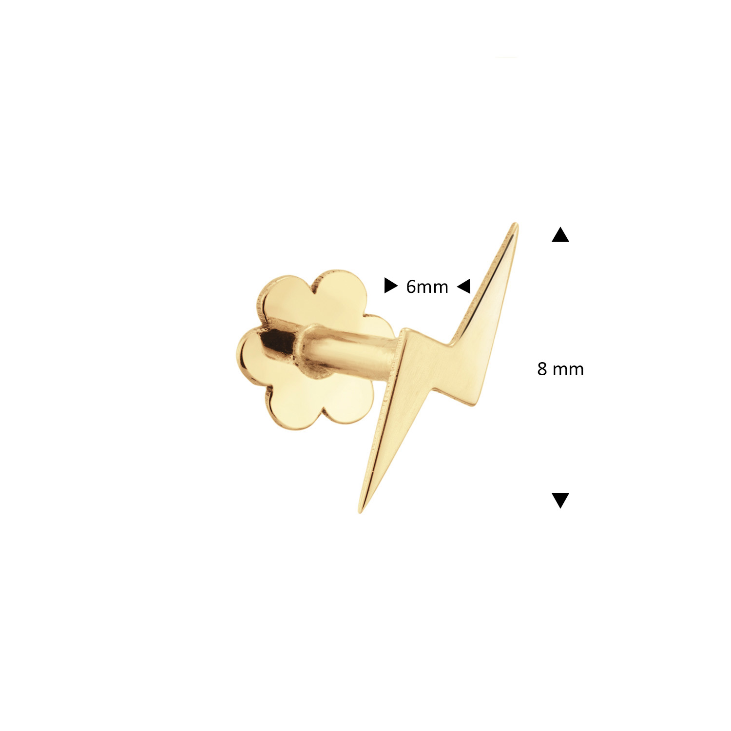 De 14 karaat gouden Lightning piercing met 2 schroefstaafjes en een bloemetje als achterkant, maken het in- en uitdoen heel makkelijk! Je kunt ze ook inhouden als je gaat slapen. Voeg als finishing touch een piercing toe aan je Jackie earparty!