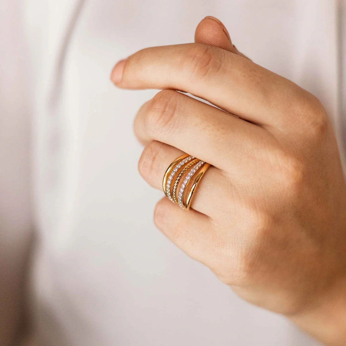 14k Geelgouden damesring met 5 banen. Twee banen glad, twee banen met zirkonia en één baan getordeerd.