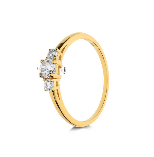 14k geelgouden ring met drie zirkonia's, elk gezet in een chaton met vier zetpoten