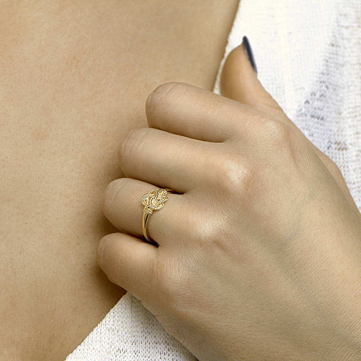 14k Geelgouden ring in de vorm van een Surinaamse mattenklopper, oftewel in het Afrikaans de Dagi knoop die verbondenheid symboliseert. De ring heeft een breedte van 9mm.