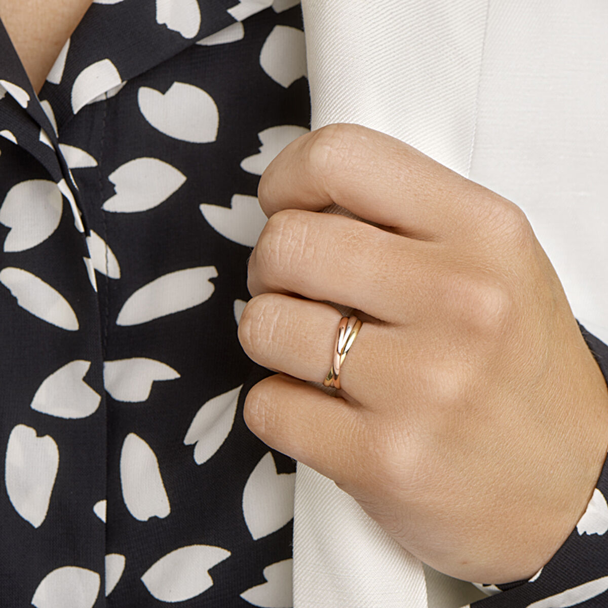 14k Tricolor wit- rose- en geelgouden ring bestaande uit 3 in elkaar geplaatste losse ringen.