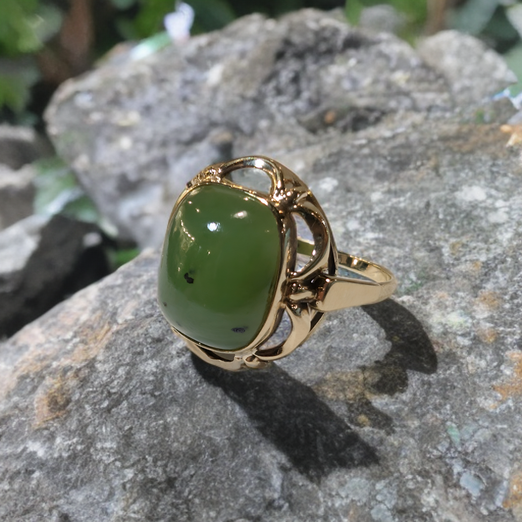 14 Karaats Geel Gouden Vintage Ring met Cabochon geslepen Nefriet (Jade).