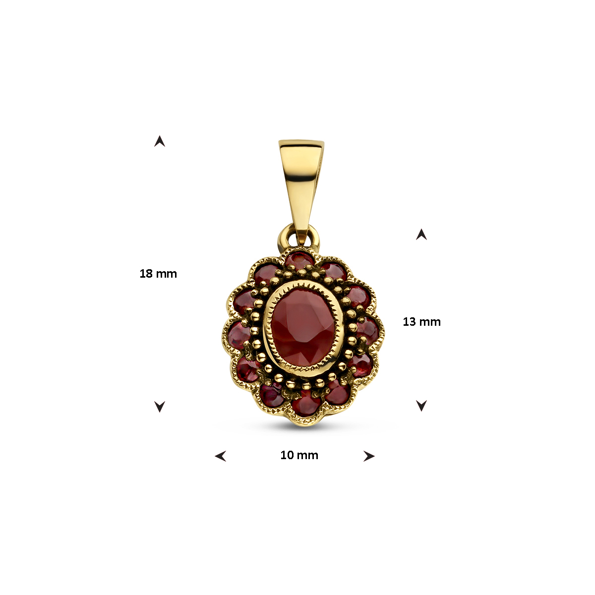 14k Geelgouden hanger uitgevoerd met robijn. De hanger heeft een totale hoogte van 18mm.