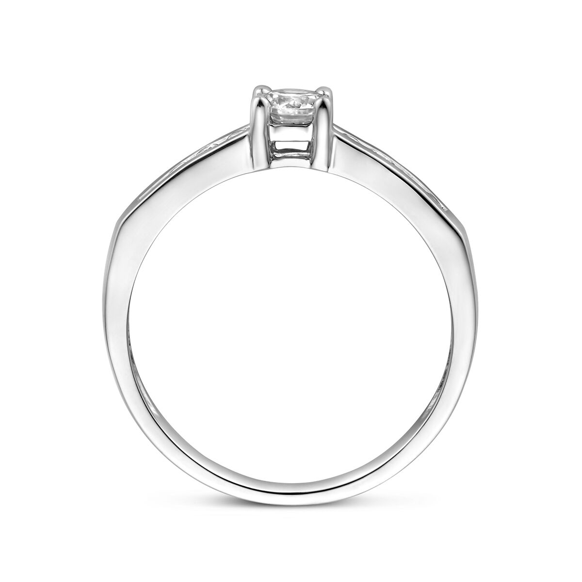 14k witgouden ring met negen zirkonia's. Eén grote middensteen, van 4mm, gezet in een chaton met vier zetpoten en aan beide zijdes vier kleinere zirkonia's geze in een railszetting