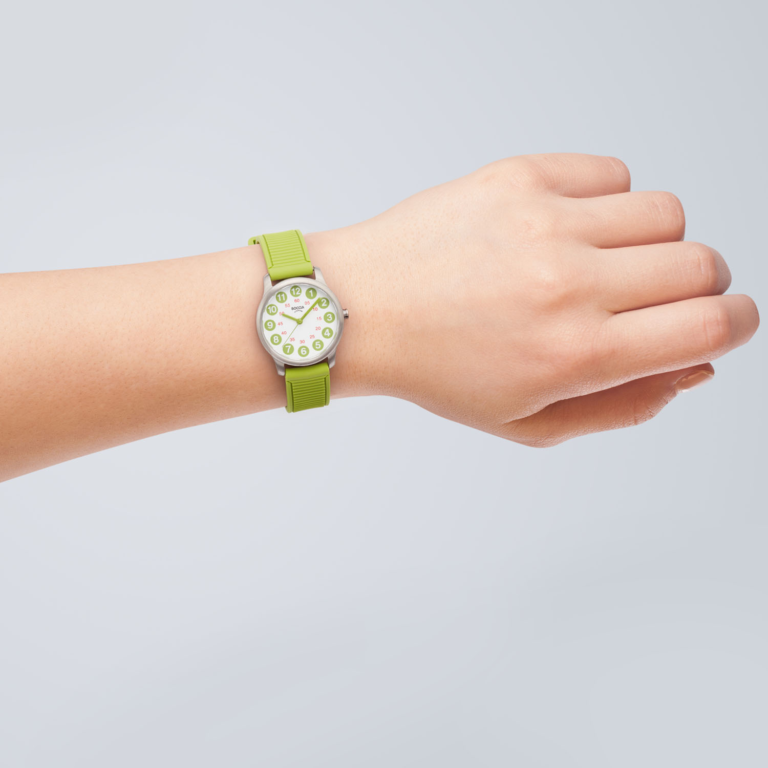 Dit kinderhorloge van Boccia heeft een speelse uitstraling. De 3373-02 heeft een ronde titanium horlogekast van 28mm met een witte wijzerplaat waarop de uren en minuten duidelijk zijn aangegeven met groene en rode kleuren. Een perfecte manier om met dit Boccia horloge klok te leren kijken. De groene bewerkte siliconenband met een gespsluiting maakt het dragen gemakkelijk. Het horloge heeft een mineraalglas en is 5ATM.