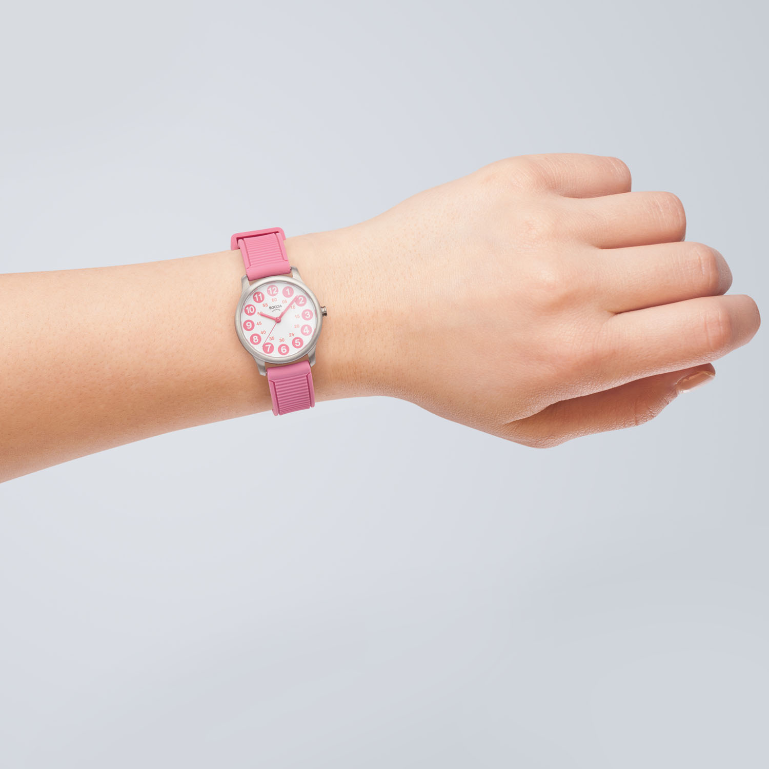 Dit kinderhorloge van Boccia heeft een speelse uitstraling. De 3373-03 heeft een ronde titanium horlogekast van 28mm met een witte wijzerplaat waarop de uren en minuten duidelijk zijn aangegeven met roze kleuren. Een perfecte manier om met dit Boccia horloge klok te leren kijken. De roze bewerkte siliconenband met een gespsluiting maakt het dragen gemakkelijk. Het horloge heeft een mineraalglas en is 5ATM.