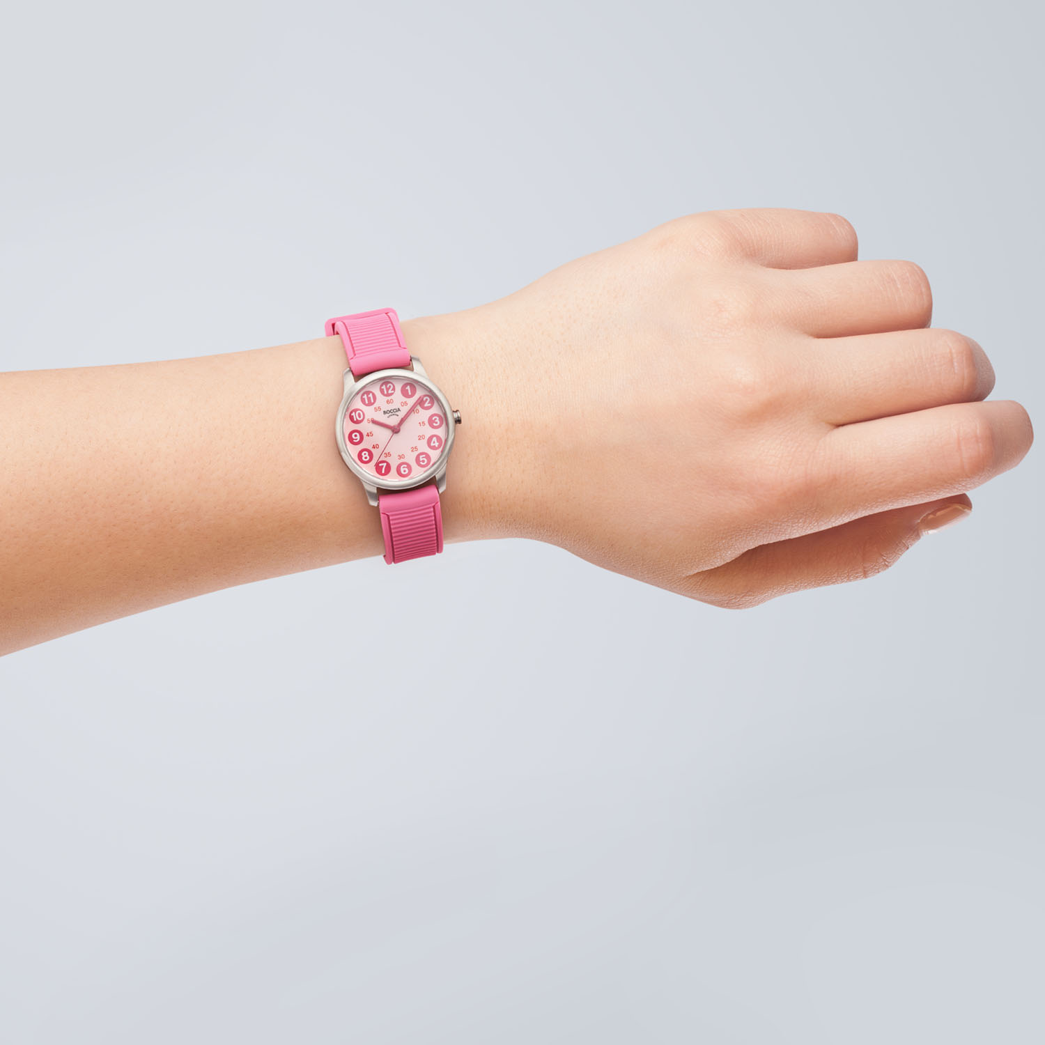 Dit kinderhorloge van Boccia heeft een speelse uitstraling. De 3373-04 heeft een ronde titanium horlogekast van 28mm met een lichtroze wijzerplaat waarop de uren en minuten duidelijk zijn aangegeven met felle roze kleuren. Een perfecte manier om met dit Boccia horloge klok te leren kijken. De roze bewerkte siliconenband met een gespsluiting maakt het dragen gemakkelijk. Het horloge heeft een mineraalglas en is 5ATM.