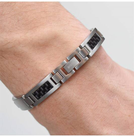 Een Titanium pennen armband met carbon inleg van het merk BOCCIA in een lengte van 21cm.