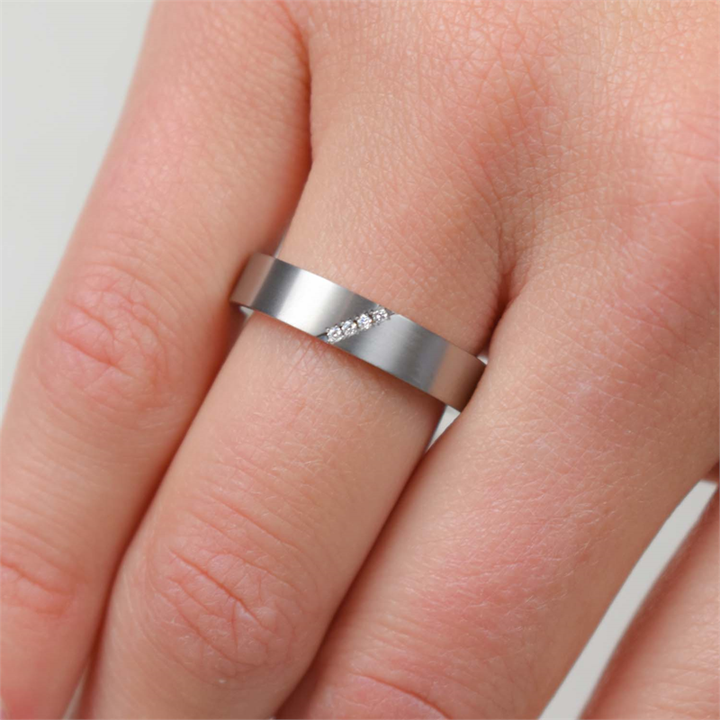 Deze gematteerde damesring van Boccia Titanium heeft vier met de hand gezette diamanten. De diamanten (0.02 ct) in dit sieraad zorgen voor een sprankelend effect. De 0121-07 is verkrijgbaar in meerdere maten, heeft een bolle binnenkant en is 4,5mm breed. Een uniek en stijlvol exemplaar dat ideaal te combineren is met andere sieraden.