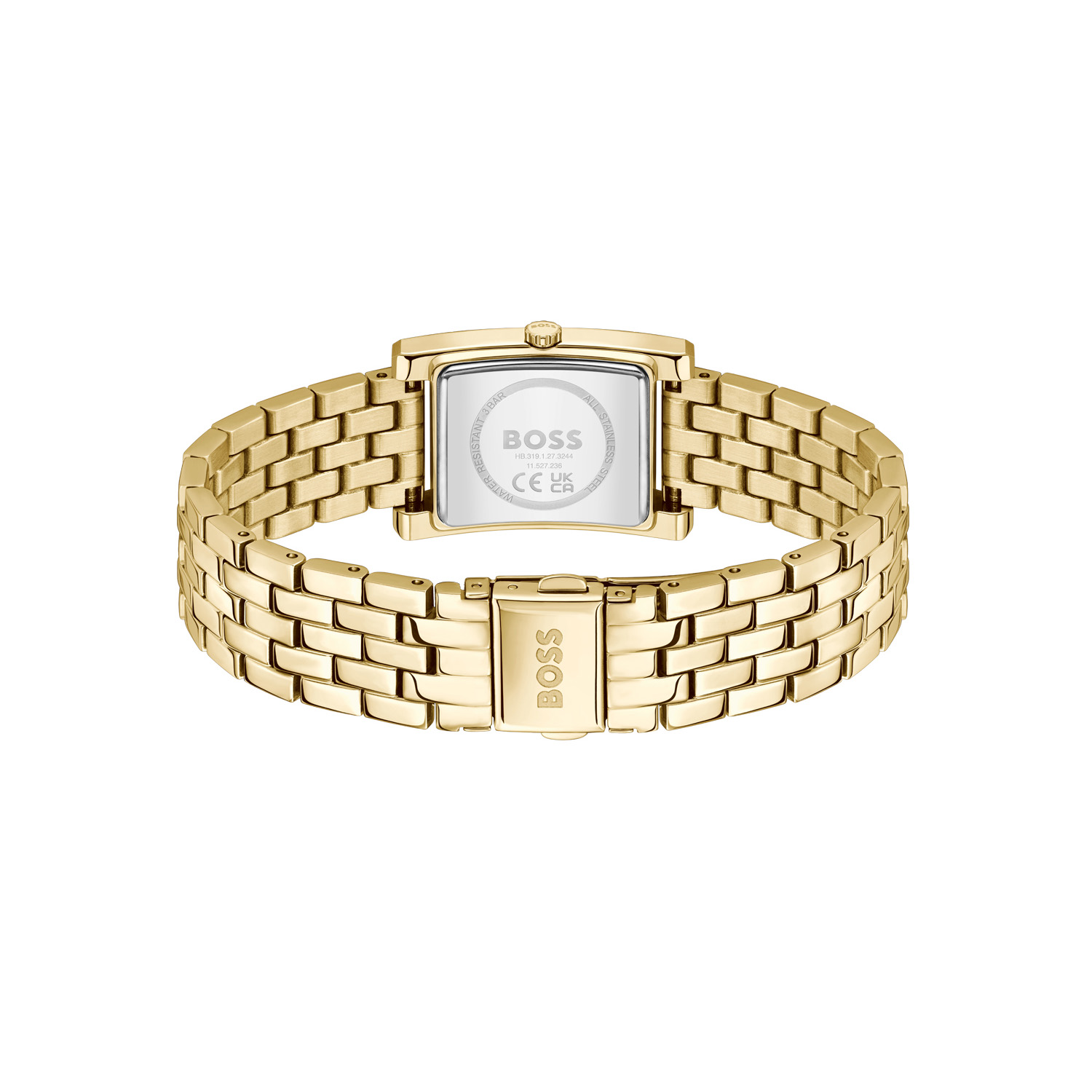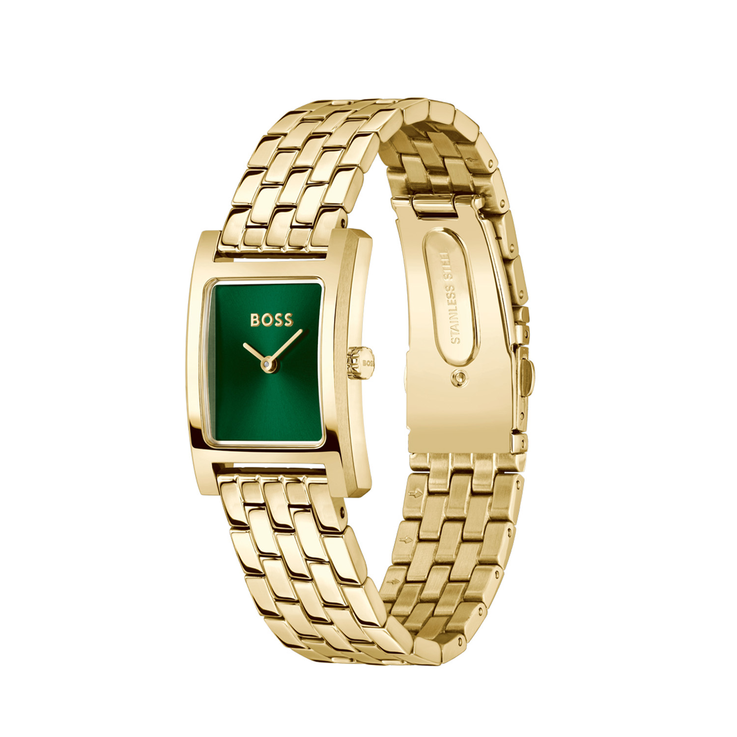 Dit BOSS dameshorloge uit de LUCY serie met artikelnr: HB1502785 heeft een chique uitstraling. Zeer geschikt voor de moderne stijlvolle vrouw van nu. Het dameshorloge valt op door zijn stalen rechthoekige goudkleurige horlogekast met een opvallend BOSS logo en hele fijne goudkleurige wijzers op een groene sunray wijzerplaat. Stijlvol en strak. Aan de kast zit een stalen fijne schakelband met een vouwsluiting. Het horloge heeft een afmeting van 22x24,5mm met een mineraalglas en is 3ATM.