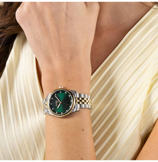 Dit BOSS horloge uit de GRACEFUL PRECIOUS serie met artikelnr: HB1502834 heeft een chique uitstraling. Dit model combineert naadloos klassiek design met eigentijdse allure. De ronde wijzerplaat, een eeuwig symbool van perfectie, straalt een ingetogen zelfvertrouwen en verfijning uit, een elegant formaat, verrijkt met prachtige kristallen. Dit dameshorloge valt op door zijn stalen horlogekast met een goudkleurige bezel en een groene sunray wijzerplaat met fijne wijzers en kristallen als uursaanduiding. Aan de kast zit een bicolor schakelband met een vouwsluiting. Het horloge heeft een doorsnee van 32mm met een mineraalglas en is 3ATM.