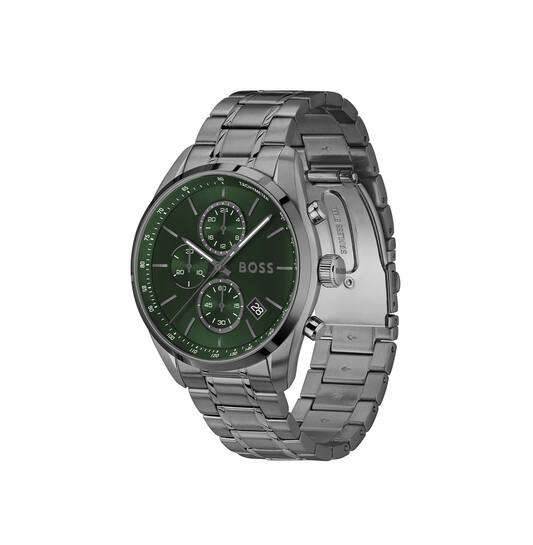 Dit BOSS by Hugo Boss Grand Prix horloge heeft een donker stalen band en kast mat en glanzend afgewerkt. Het horloge heeft een Chronograaf(stopwatch) functie en datum. Onder de achterdeksel vindt u een betrouwbaar VR33B Epson Quartz uurwerk.