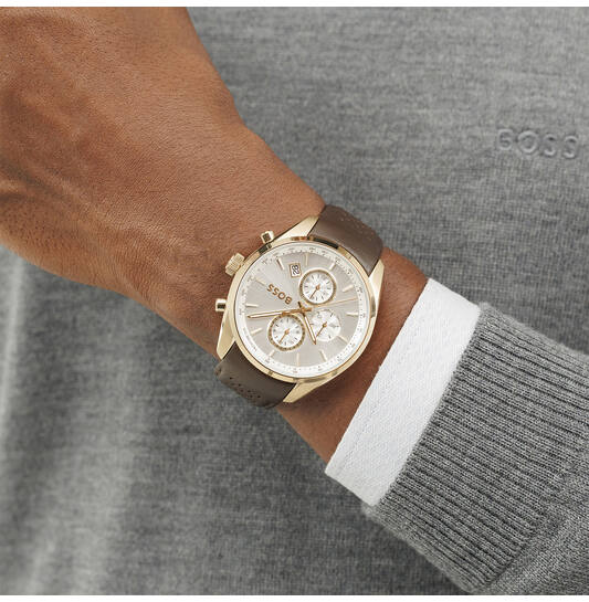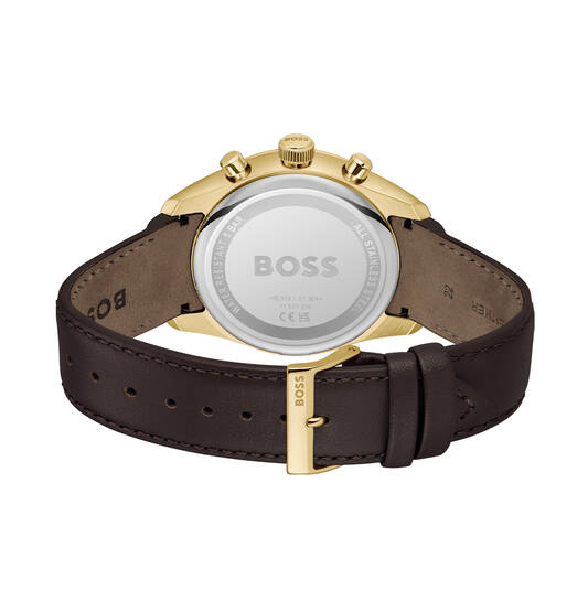 Dit BOSS by Hugo Boss GRAND PRIX horloge heeft een vergulde kast en een sportieve bruin lederen band.
