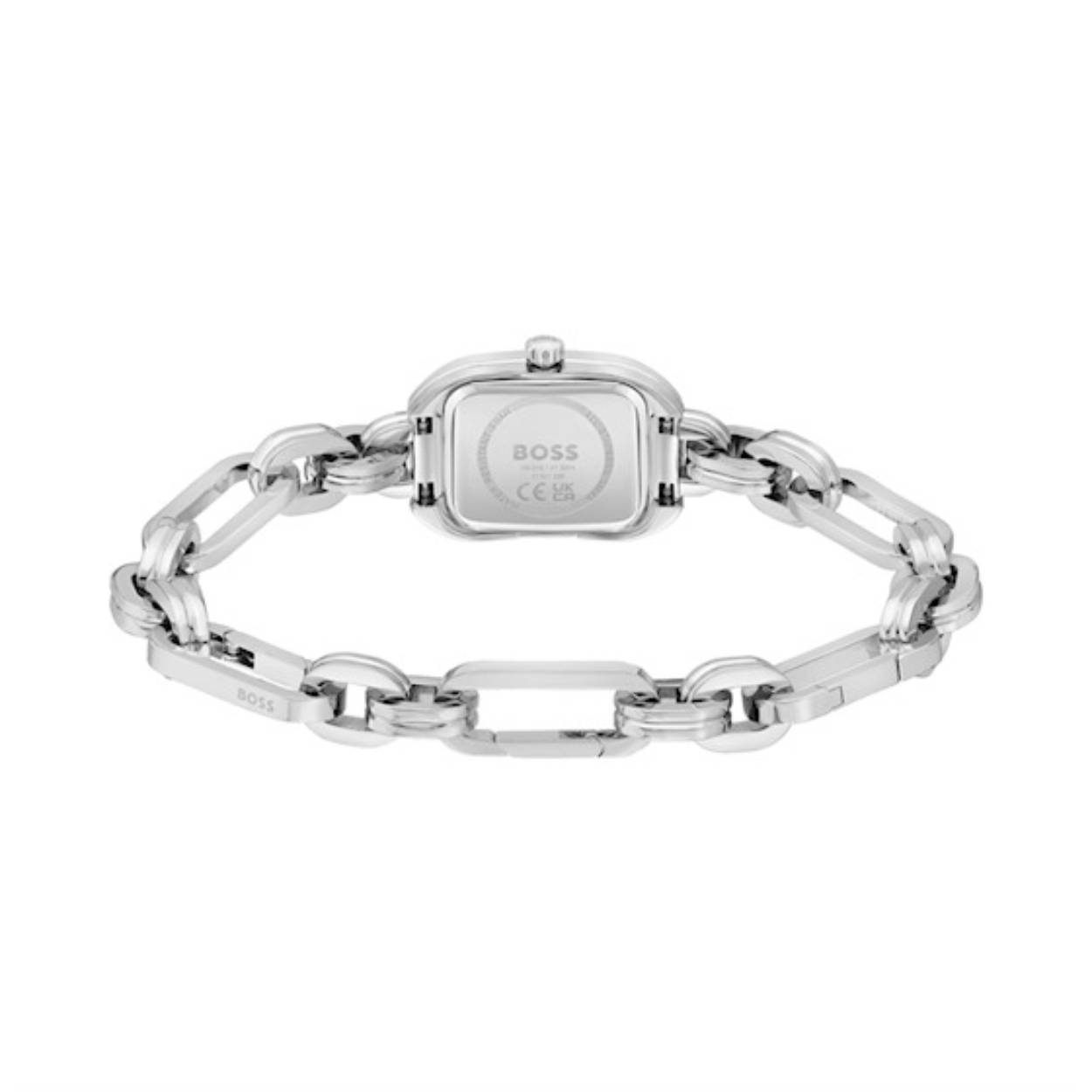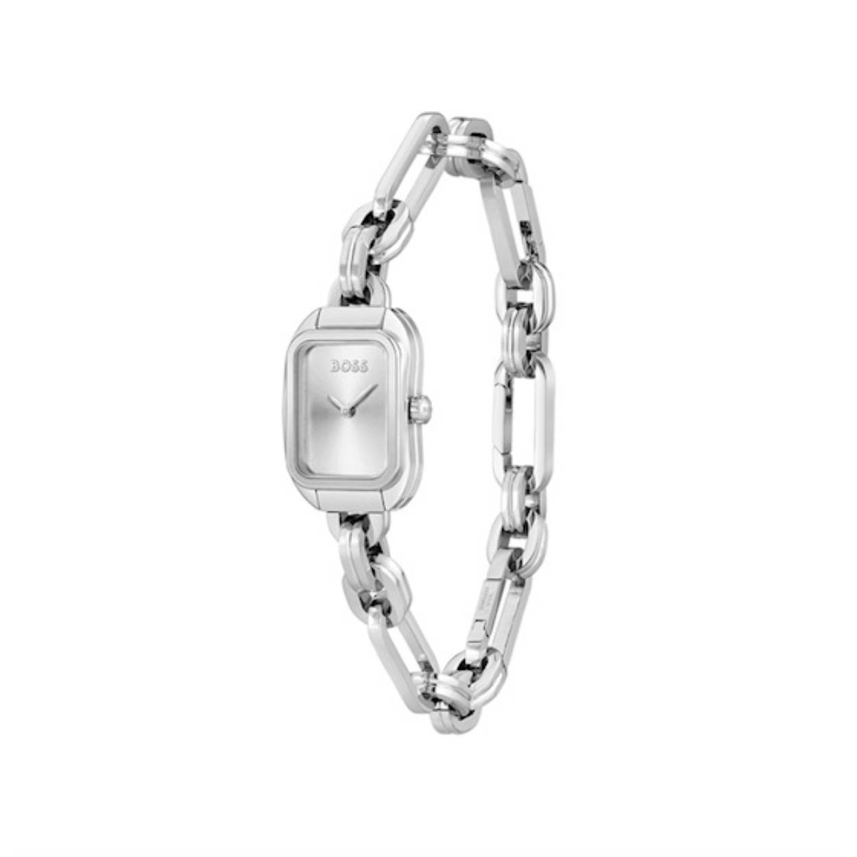 Dit Boss by Hugo Boss horloge, uit de Hailey collectie, heeft een stalen band en kast. De wijzerplaat is sunray silver met zilverkleurige wijzers en 'Boss' logo.
