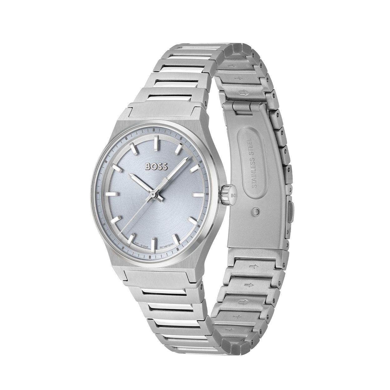 Dit BOSS horloge uit de CANDOR serie met artikelnr: HB1502736 heeft een luxe sportieve uitstraling. Zeer geschikt voor de moderne stijlvolle vrouw van nu. Het dameshorloge valt op door zijn zilverkleurige stalen horlogekast met een gladde bezel en een lichtblauwe sunray wijzerplaat. De fijne gepolijste wijzers en fijne gepolijste uursaanduiding hebben een lumibrite laagje en geven dit horloge een chique uitstraling. Aan de kast zit een zilverkleurige stalen fijne schakelband met een vouwsluiting. De kast van het horloge heeft een doorsnee van 35mm met mineraalglas en is 5ATM.