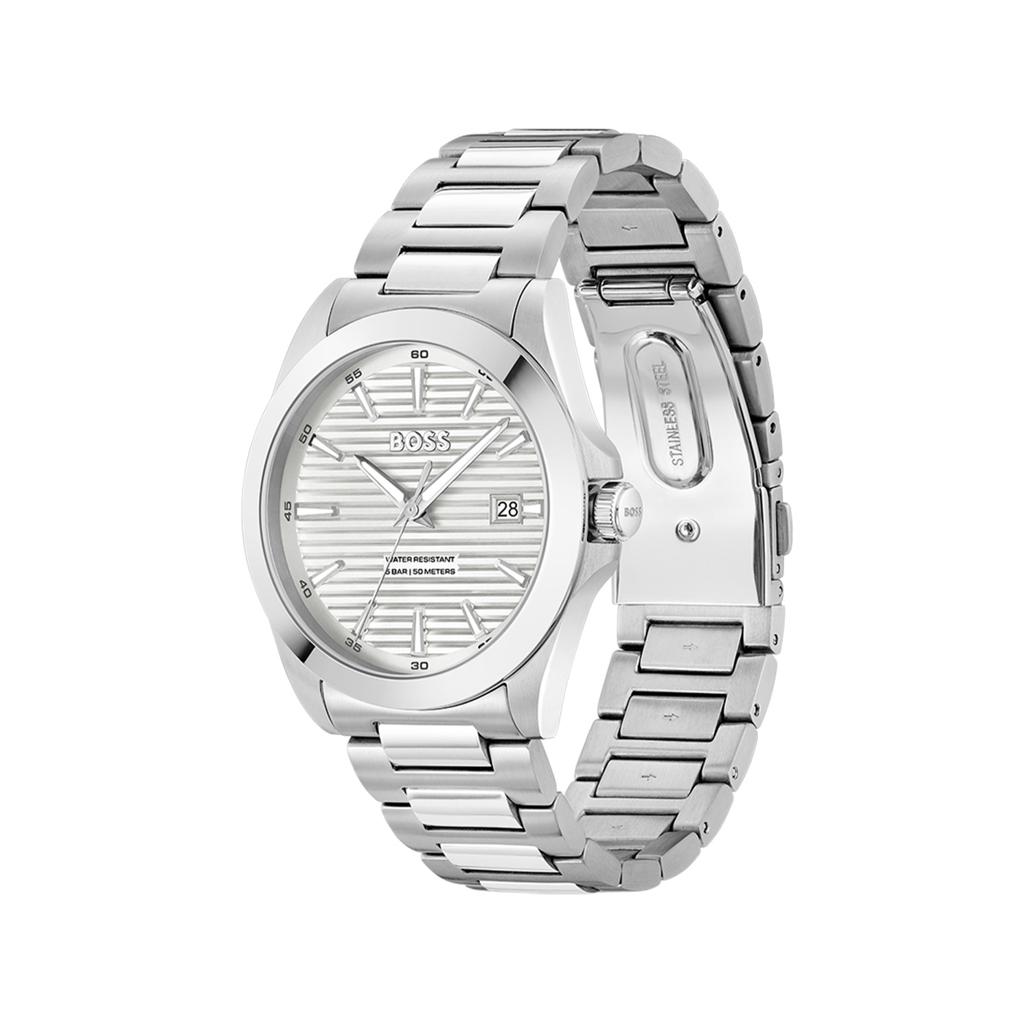Een stalen horloge van het merk BOSS by Hugo Boss, voorzien van een stevige stalen band, een waterbestendige kast en subtiel horizontaal gestreepte zilverkleurige wijzerplaat.