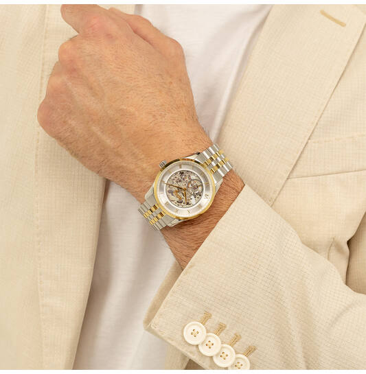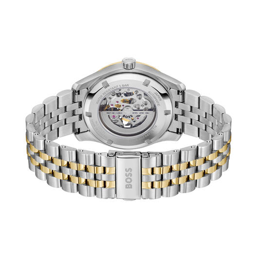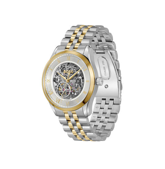 BOSS by Hugo Boss Principle Skeleton Horloge bevat een in Japan ontworpen Automatisch 8N24 Miyota Uurwerk met 21 edelstenen op slijtagepunten en een geschatte gang reserve van 42 uur. Het horloge heeft een opengewerkte wijzerplaat en glazen deksel. De bicolor massief stalen band en kast zijn verfijnt mat en glanzend afgewerkt. Een chique eye-catcher.