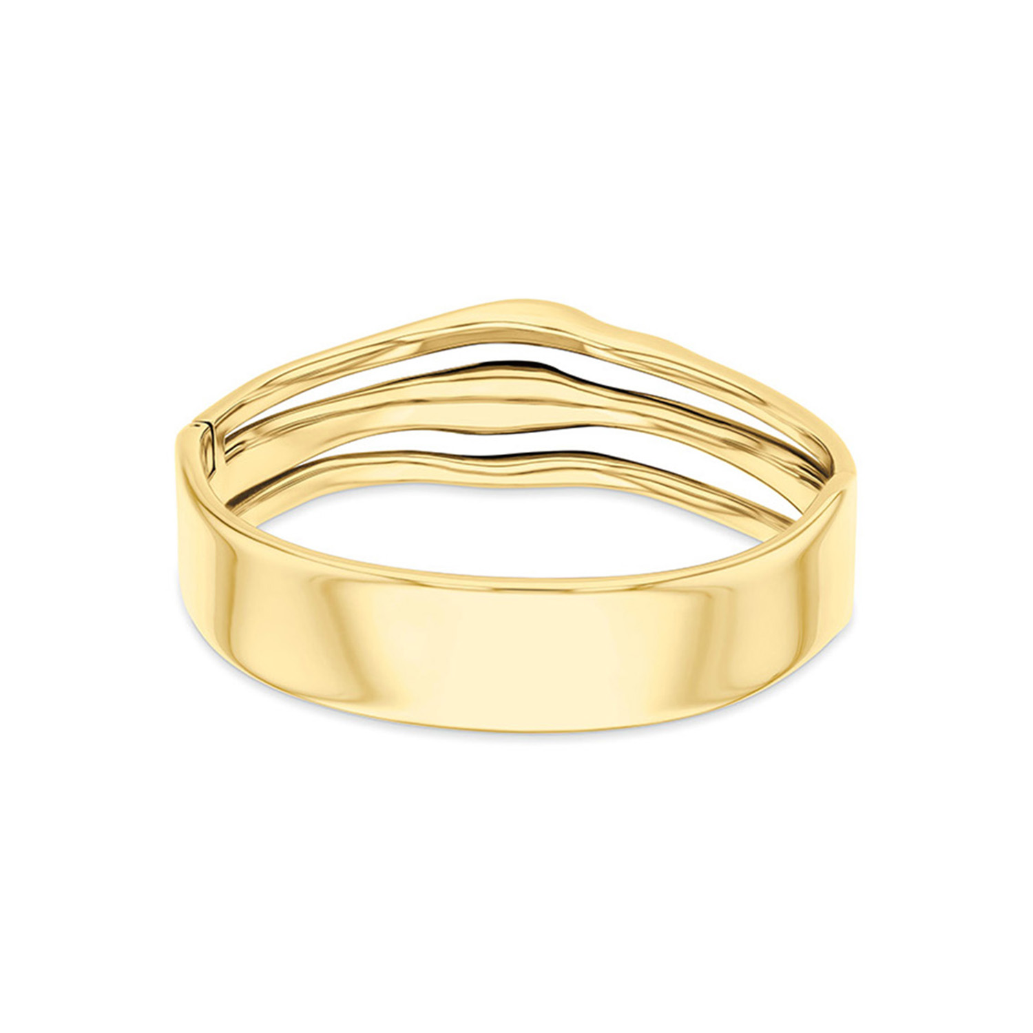 Deze stalen dames bangle van Calvin Klein met nr CJ35000719 heeft een sierlijk uiterlijk. De goudkleurige bangle armband heeft bovenop 3 aparte sculpturele banden met ronde vormem.  Een fantasierijk geheel
