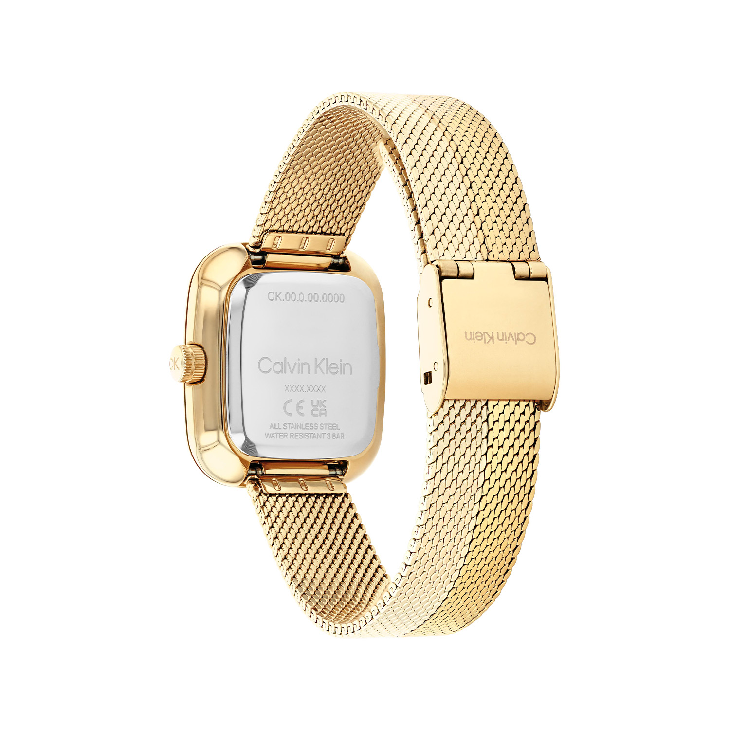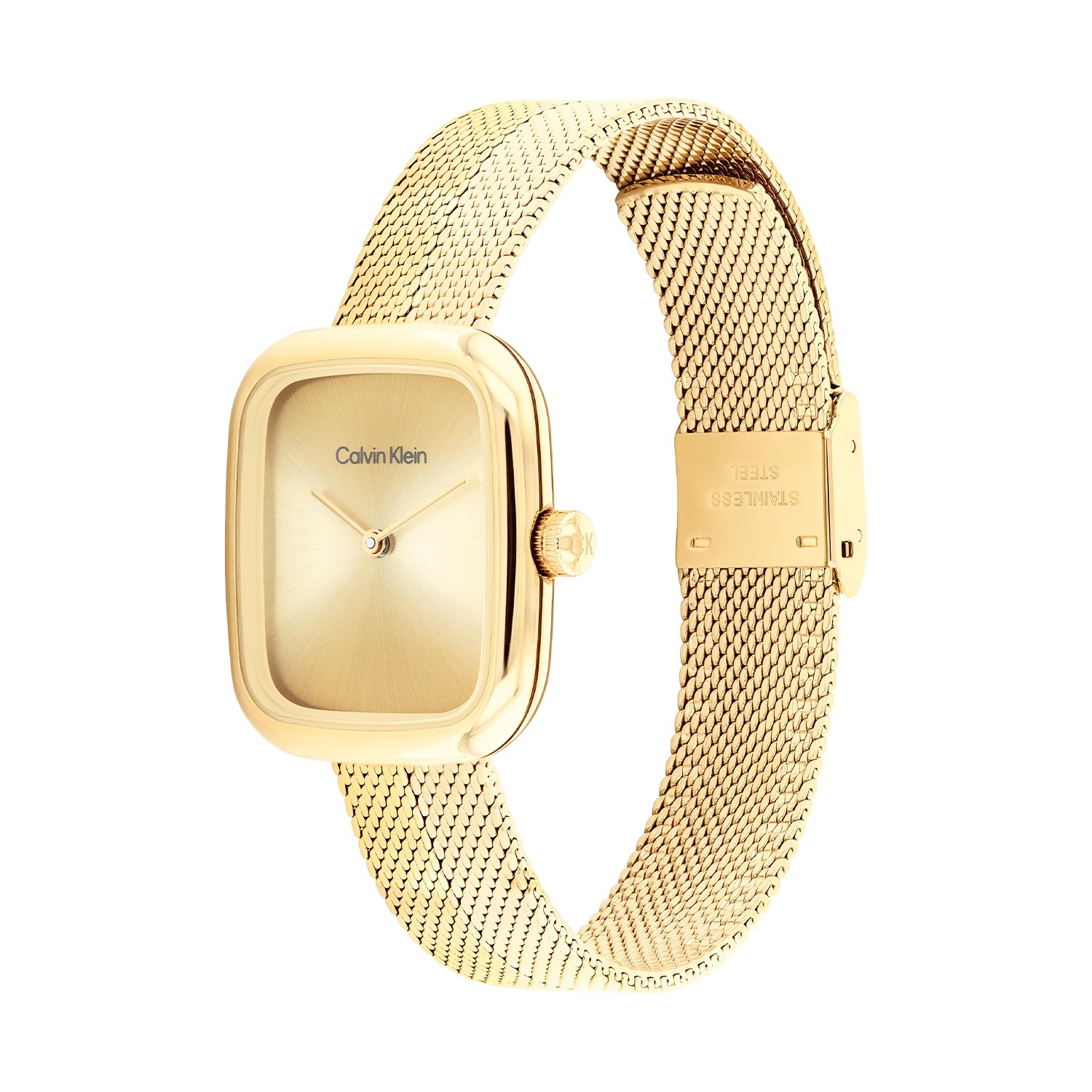 Dit Calvin Klein dameshorloge met nr CK25100099 is een klassiek ontwerp. De stijlvolle rechte stalen goudkleurige kast heeft een gladde bezel en een champagnekleurige sunray wijzerplaat met fijne wijzers. Strak aan de kast zit een stalen fijne gevlochten goudkleurige band met een drukluiting. Het elegante dameshorloge heeft een mineraalglas, een doorsnee van 30mm en is 3ATM.