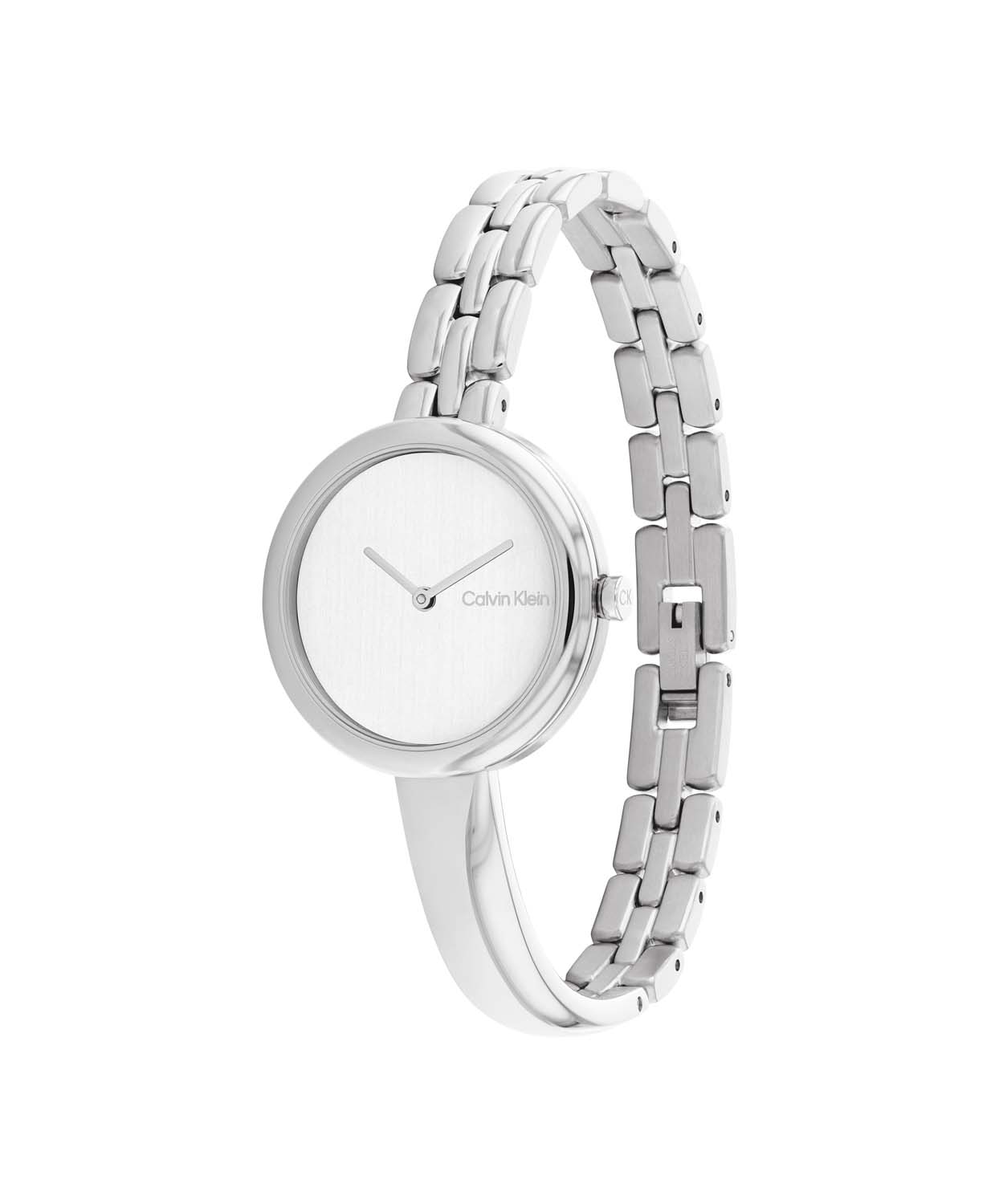 Dit Calvin Klein horloge, uit de Bangled collectie, is een chique ontwerp. De ronde zilverkleurige stalen kast heeft een gladde zilverkleurige bezel. Op de zilverwitte brushed wijzerplaat is de merknaam gedrukt en de tijd wordt aangegeven met hele fijne wijzers. Aan de stalen kast zit een zilverkleurige half bangle, half geschakelde band. Het sierlijke horloge heeft een mineraalglas, een doorsnee van 28mm en is 3 ATM.