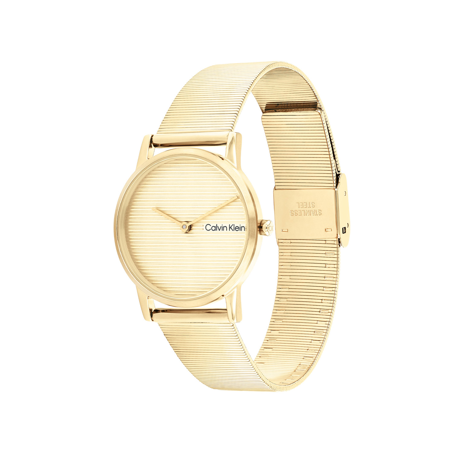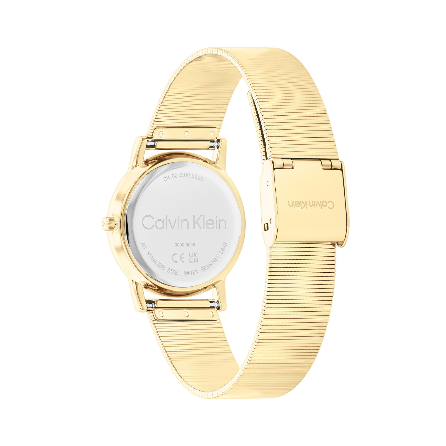 Dit Calvin Klein dameshorloge met nr CK2510035 is een minimalistisch ontwerp. De stijlvolle ronde stalen goudkleurige kast heeft een gladde bezel met een goudkleurige wijzerplaat met alleen wijzers als uursaanduiding. Aan het horloge zit een strakke milanese band met klapluiting. Het horloge heeft een mineraalglas met fijne lijntjes op de wijzerplaat, een doorsnee van 30mm en is 3ATM.