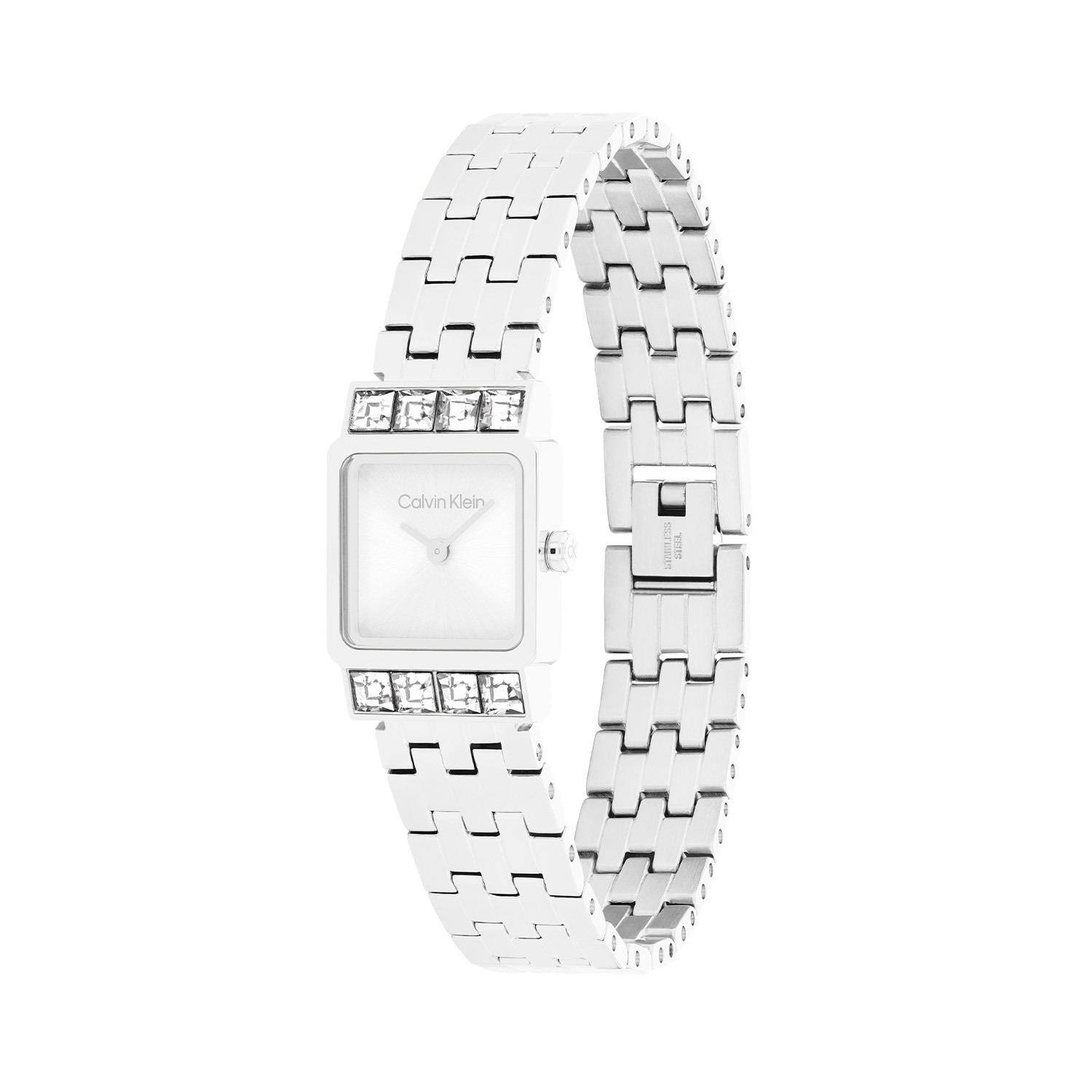 Dit Calvin Klein dameshorloge met nr CK25100161 heeft een chique ontwerp. Het stalen horloge heeft een vierkant kastje met een fijne bezel, boven en onder een rand met kristallen en een zilverwitte sunray wijzerplaat met fijne wijzers en de merknaam. Aan de kast zit een stalen fijne schakelband met een druksluiting. Het dameshorloge heeft een mineraalglas, een doorsnee van 16mm en is 3ATM.