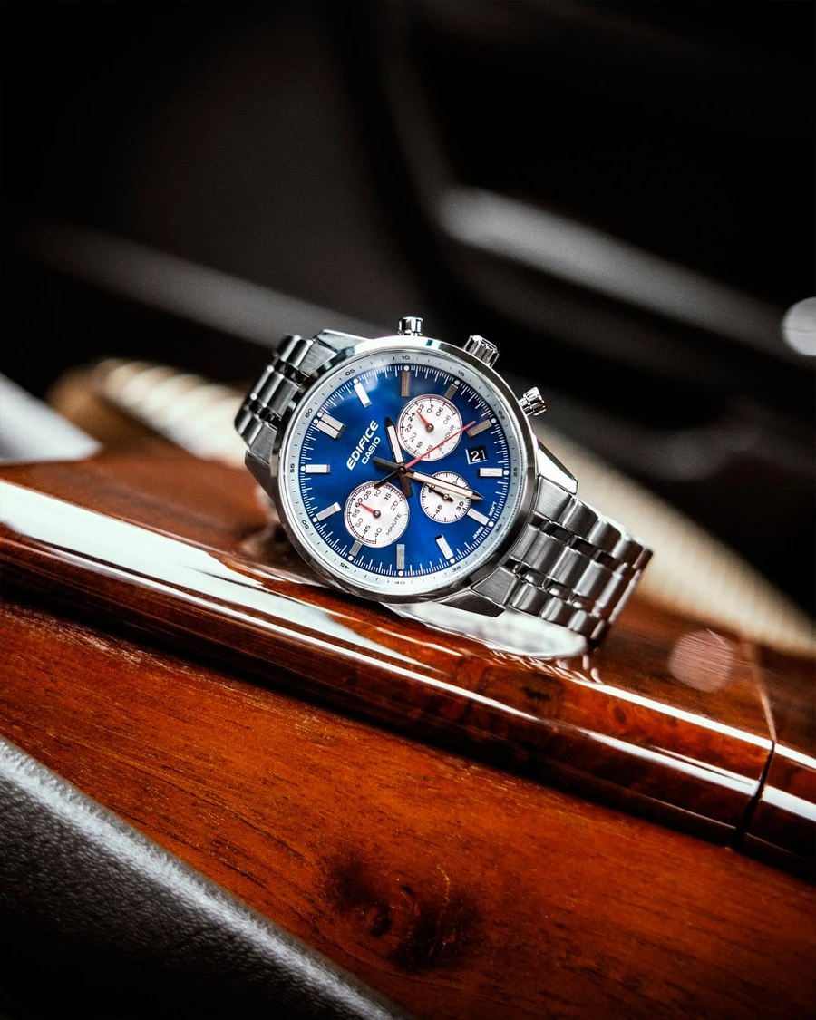 De EDIFICE chronograaf is geïnspireerd op de bolle glazen meters van de klassieke sportwagen.