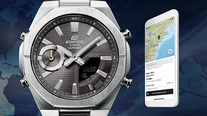 Synchroniseer met je smartphone via Bluetooth® voor automatisch aangepaste precisietijdmeting. Gebruik de app om moeiteloos de wereldtijd te beheren, waar je ook naartoe reist. Of het nu voor zaken of plezier is, internationale reizen verlopen naadloos met automatische updates voor de lokale tijd en zomertijd. De app maakt ook het beheren van alarmen, tijden en andere functies eenvoudig en intuïtief.