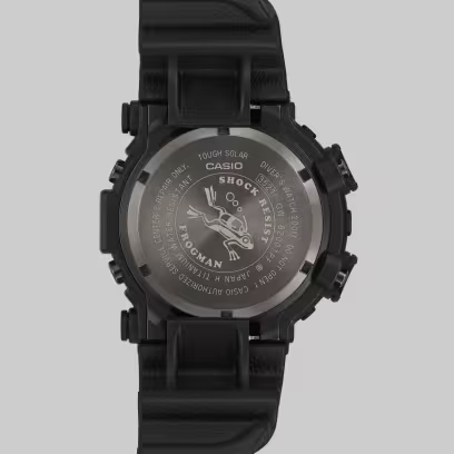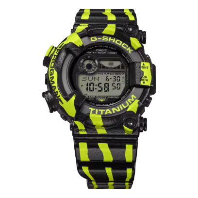 Gedurfde verticale strepen in fluorescerend groen steken af tegen een zwarte basis voor een opvallende, stoere look die de intensiteit van de dartkikker laat zien. De band en bezel zijn afgewerkt met een spraycoating die de textuur van de huid van de kikker oproept. En de achterkant van de kast is natuurlijk gegraveerd met het iconische duikende kikkerkarakter dat op elk Frogman-uurwerk staat.