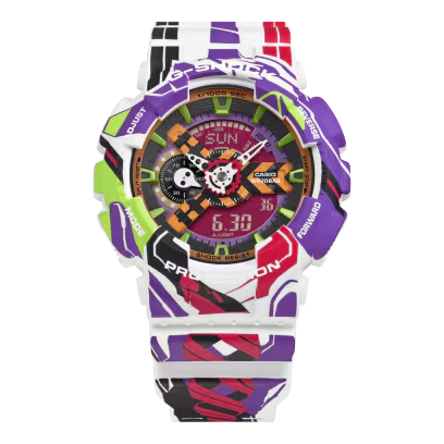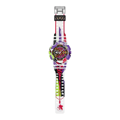 De GA-110, die ook werd gebruikt in de eerste EVANGELION samenwerking in 2010, dient als basismodel. EVA Unit-01, de centrale figuur van de serie, verschijnt overal in het ontwerp: zijn gehoornde hoofddeksel op de korte band, zijn gezicht op de ring en zijn rechterarm die de Speer van Longinus vasthoudt - net voor de worp - die zich uitstrekt van de onderste ring naar de lange band. Casio's geavanceerde oppervlaktebewerkingstechnieken reproduceren het gedetailleerde artwork van Yamashita natuurgetrouw.