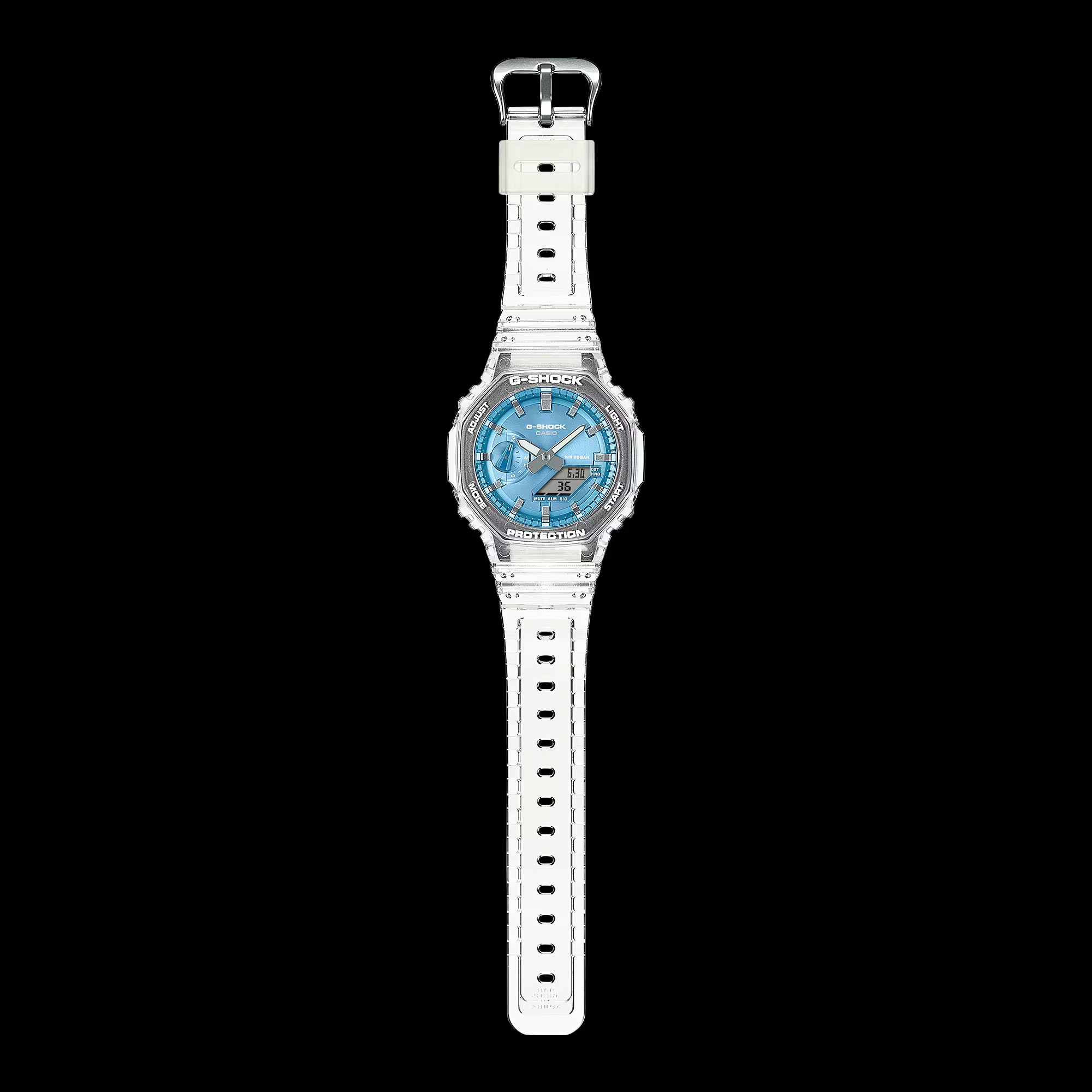 De GA-2100 met achthoekige lunette is gecombineerd met een wijzerplaat die is afgewerkt met metallic in een populaire kleur - blauw - gecombineerd door een doorschijnende band voor een zelfverzekerde coole look.