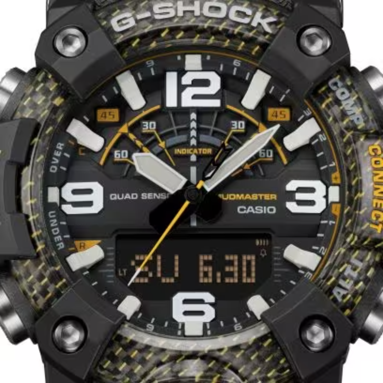 Overwin zwaar terrein en trek de aandacht met een robuust uurwerk met een gedurfd, opvallend kleurenschema. Speciale MASTER of G-horloges zijn ontworpen om zelfs in de zwaarste omstandigheden te werken en brengen tijdregistratie naar nieuwe hoogten met een robuust ontwerp dat wordt geaccentueerd in het heldere geel dat wordt gebruikt bij noodgevallen. De GG-B100 MUDMASTER is gemaakt van stevige koolstof in de kast om schade en vervorming te voorkomen, en die voor een hoge luchtdichtheid en schokbestendigheid zorgt. Dit uurwerk bevat ook een filter dat beschermt tegen het binnendringen van modder, een paneel op de achterkant van roestvrij staal en een achterkant van schokbestendig fijn hars met glasvezel, waardoor het een hoge mate van weerstand tegen stof en modder biedt. De rand bestaat ook uit drie lagen fijn hars met inzetstukken van koolstofvezel. Dit stoere, robuuste ontwerp wordt geaccentueerd in fel geel. Dit praktische en functionele horloge is uitgerust met een digitaal kompas, hoogtemeter/barometer, thermometer en stappenteller. U kunt eenvoudig de tijd corrigeren met de speciale G-Shock-app en veel andere handige functies gebruiken, zoals de Mission Log-functie, die automatisch hoogtegegevens van de app vastlegt die zijn verkregen met het horloge en routegegevens die zijn verkregen met uw smartphone.