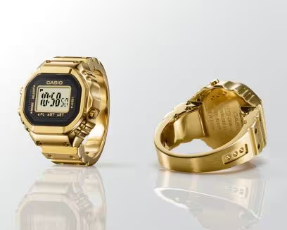 Het was niet eenvoudig om een versie op ringformaat te maken van de complexe vorm en functies van het Casio-horloge. Om dit mogelijk te maken, moesten we gebruik maken van geavanceerd spuitgieten van metaal (MIM) om fijne details met precisie na te maken in roestvrij staal. De ring is vervolgens afgewerkt met goudkleurige ion-plating voor een gepolijste glans.