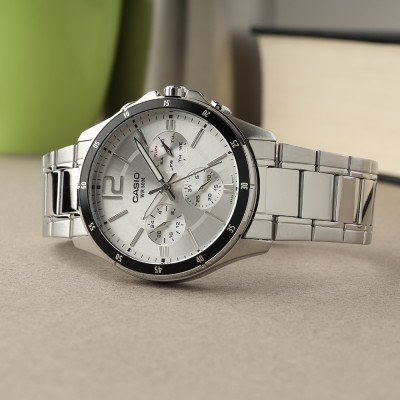 Casio horloge, uit de timeless collectie, met een stalen band en kast. Het horloge is voorzien van een dag, datum en 24-uurs aanduiding