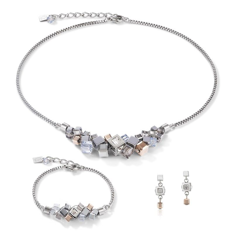 Coeur de Lion collier met GeoCUBE cluster in de kleur zilver en roségoud, handgemaakt van glanzend hematiet met een finishing touch van titaniumoxide en sprankelende Swarovski®-kristallen en kristalglas.