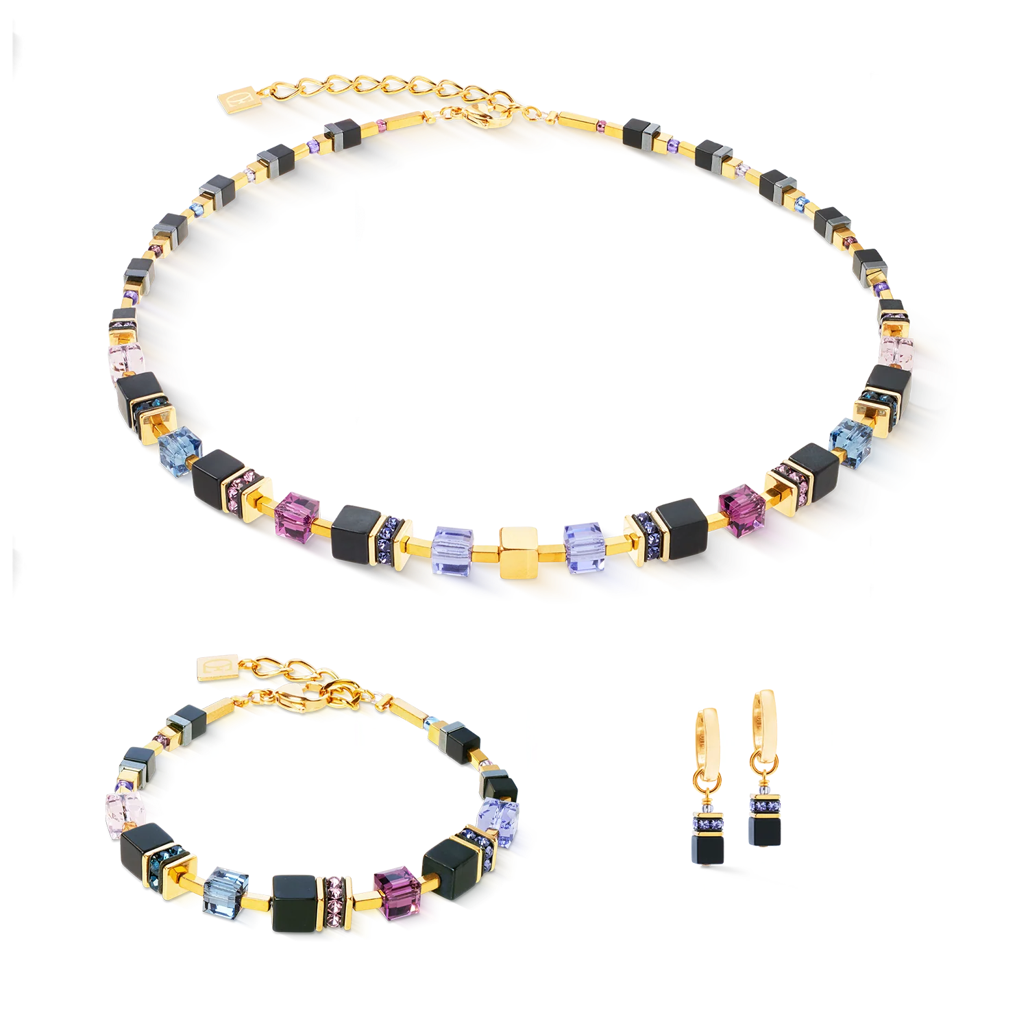 Klassiek design gecombineerd met krachtige kleuraccenten: de 6 mm grote GeoCUBE® kubussen in middernachtblauw, violet, rosé en ijsblauw, gecombineerd met diepzwarte onyx en fonkelende kristallen, zorgen voor een opvallend totaalbeeld. Fijne, kubusvormige elementen van goudkleurig hematiet zorgen voor elegante accenten tussen de stenen. Aan de achterkant loopt de steen subtiel taps toe voor optimaal draagcomfort - een sieraad met verfijning.