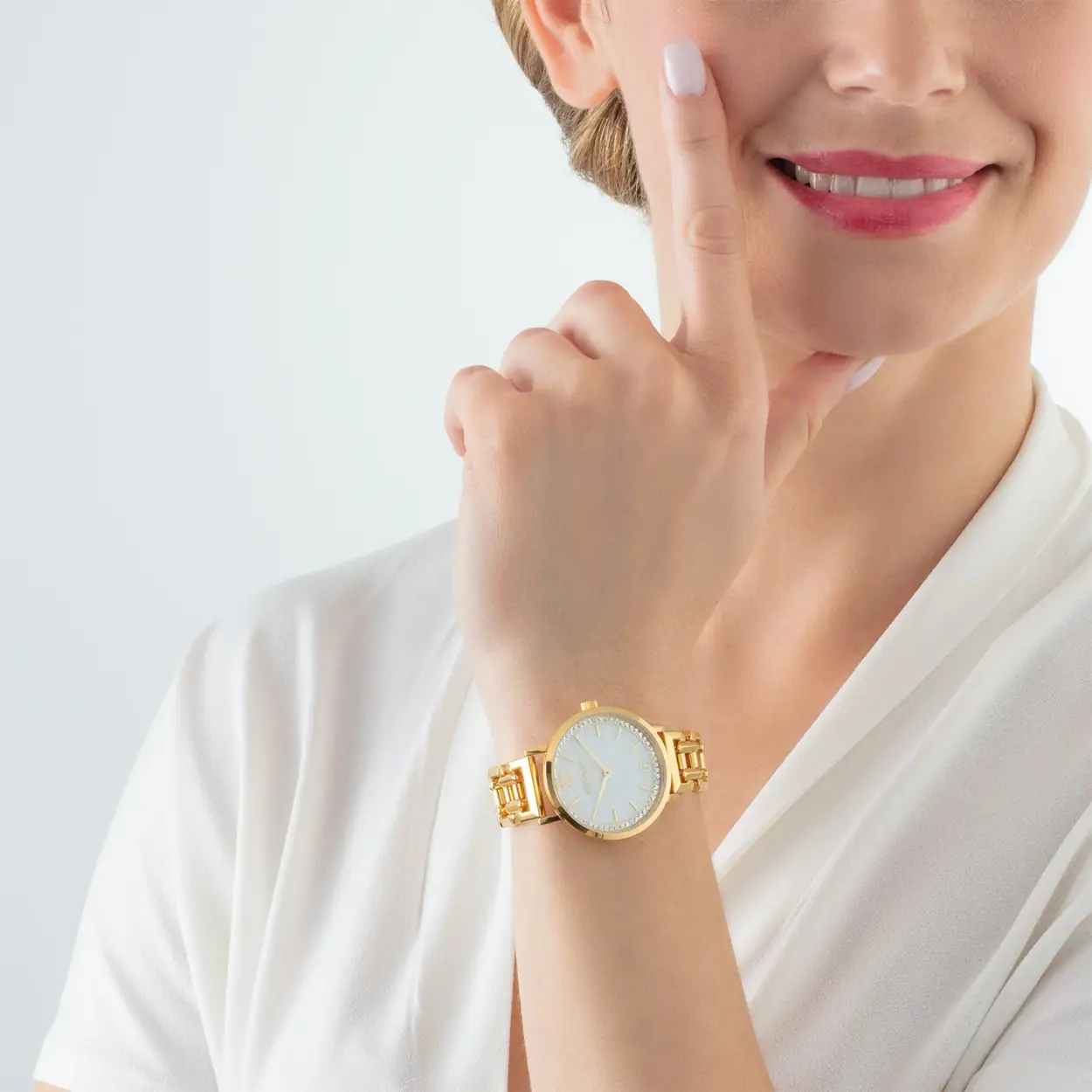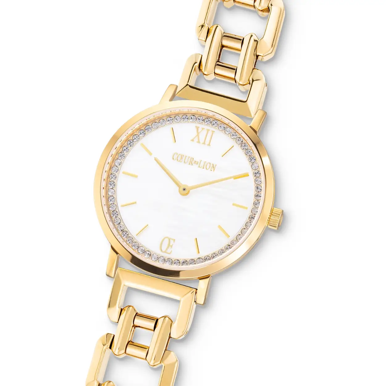 Dit Coeur de Lion horloge heeft een vergulde stalen band en kast. De wijzerplaat is wit parelmoer met goudkleurige indexen en wijzers. Rondom de wijzerplaat zijn glinsterende steentjes geplaatst voor een chique uitstraling