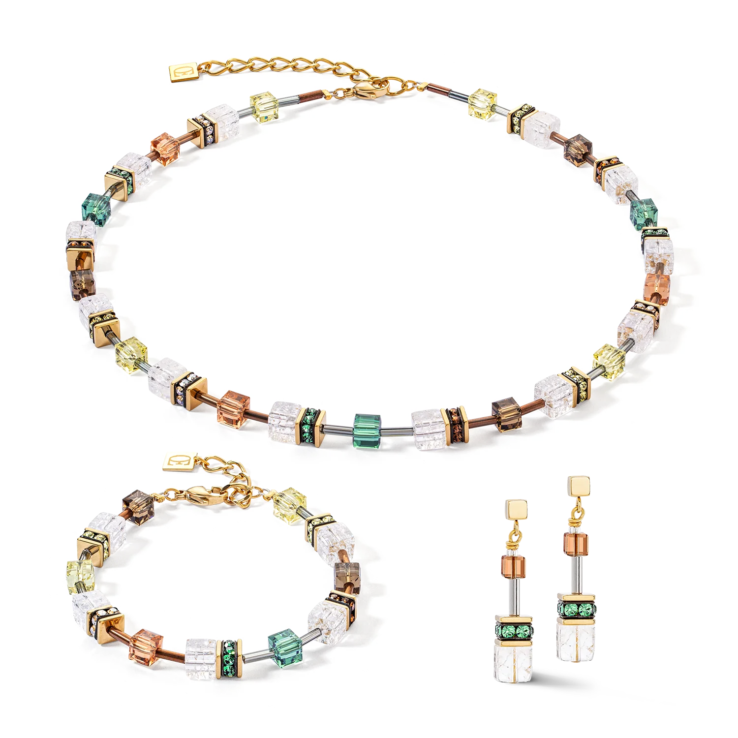 De GeoCUBE® Iconic Nature oorhangers vervaardigd met verguld staal, Swarovski kristal, bergkristal en strassrondellen