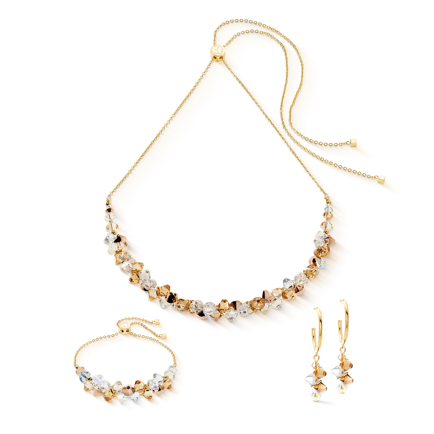 De Dancing Crystals oorhangers in goudbeige - een stralende schittering in beweging. De Dancing Crystals oorhangers in goudbeige sluiten aan op het principe van de collectie: Swarovski® kristallen in zachte beigetinten hangen aan goudkleurige ringen en bewegen met een sprankelende lichtheid bij elke beweging. Het contrast tussen de warme kristalkleuren en het glanzende roestvrij staal in goud geeft de oorbellen een elegante maar moderne uitstraling. Ze zijn gemakkelijk te dragen en maken indruk, zowel in het dagelijks leven als bij speciale gelegenheden waar een beetje extra glans gewenst is.