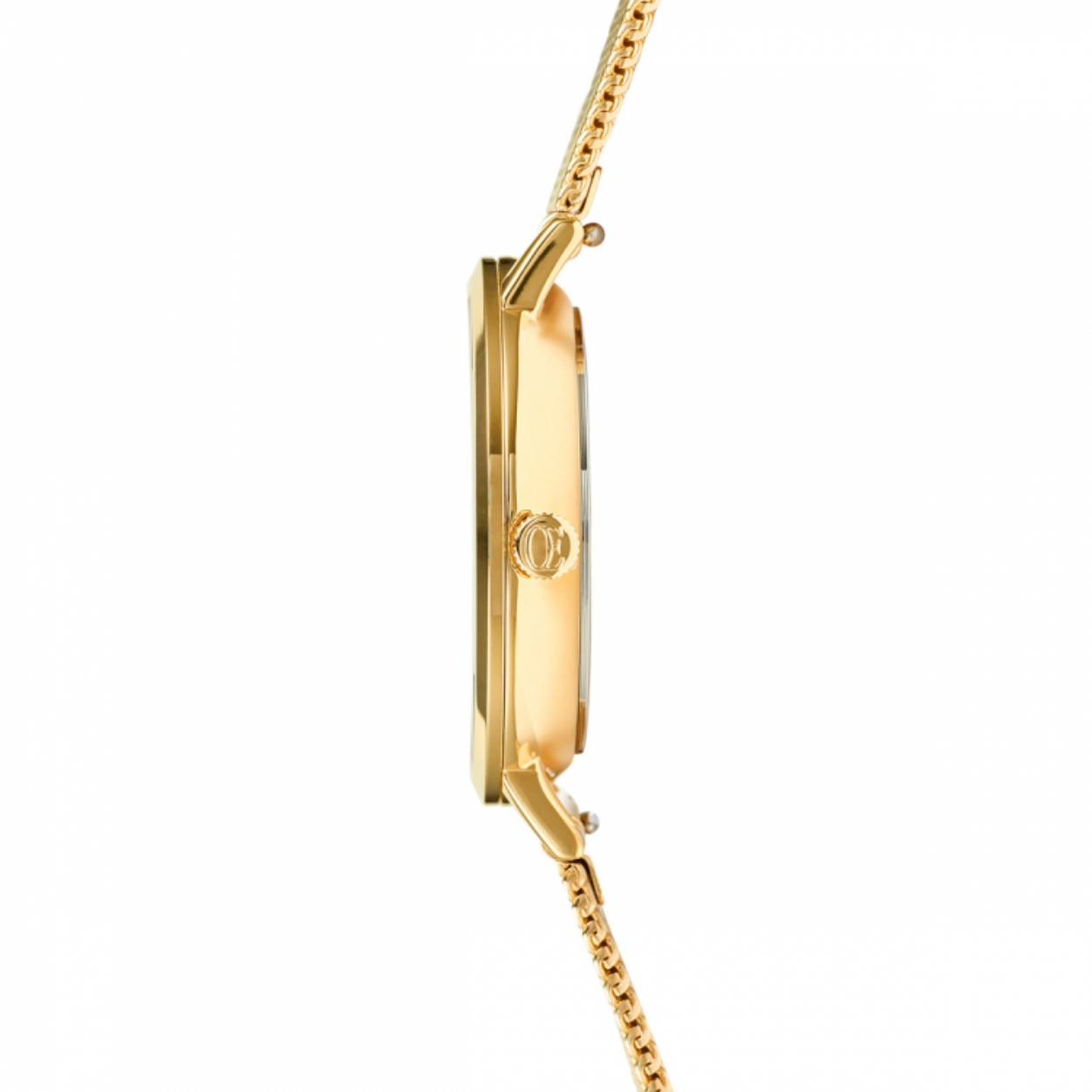 Het horloge heeft een vergulde stalen kast en milanese band. De wijzerplaat is wit met verschillende gekleurde Swarovski krsitallen als indexen.