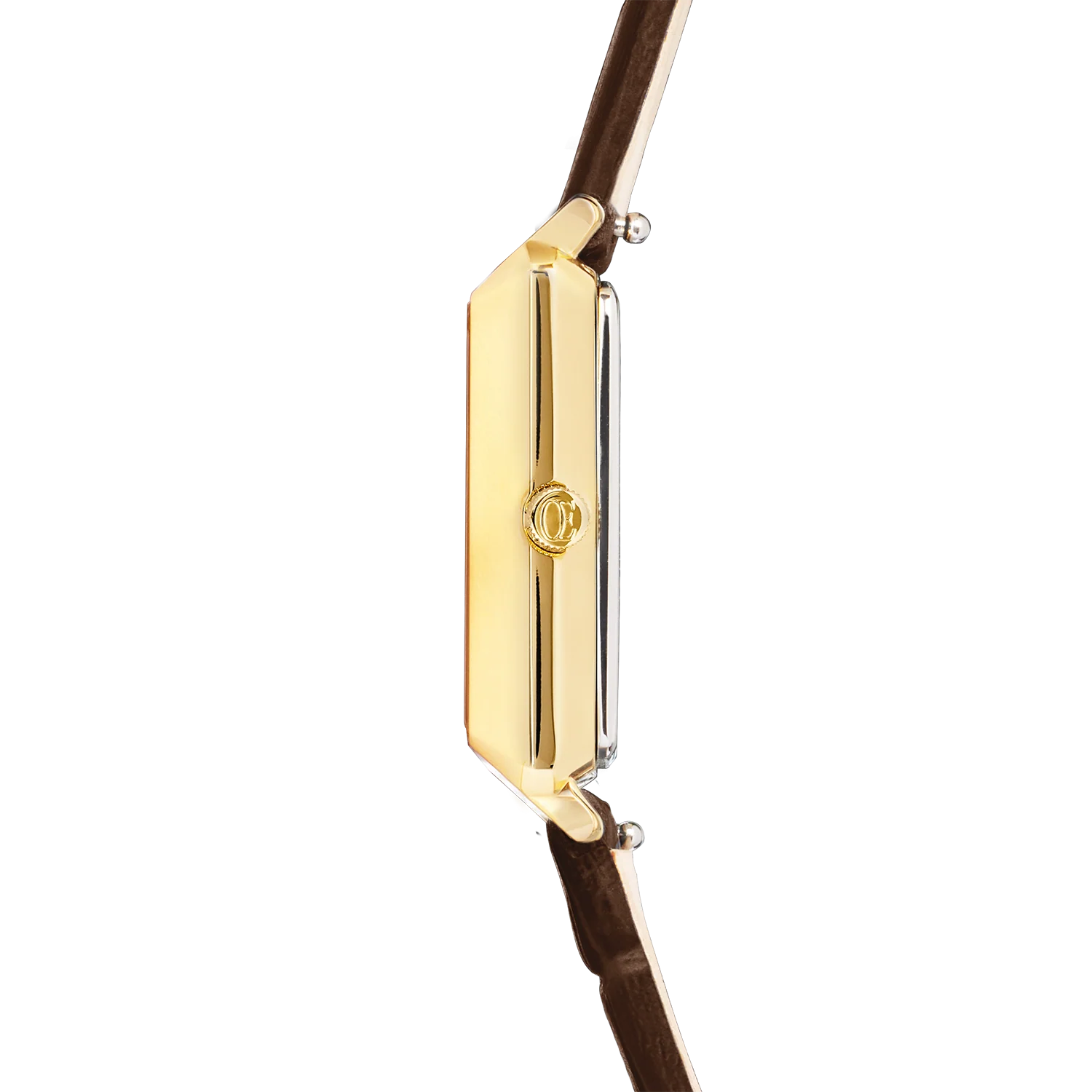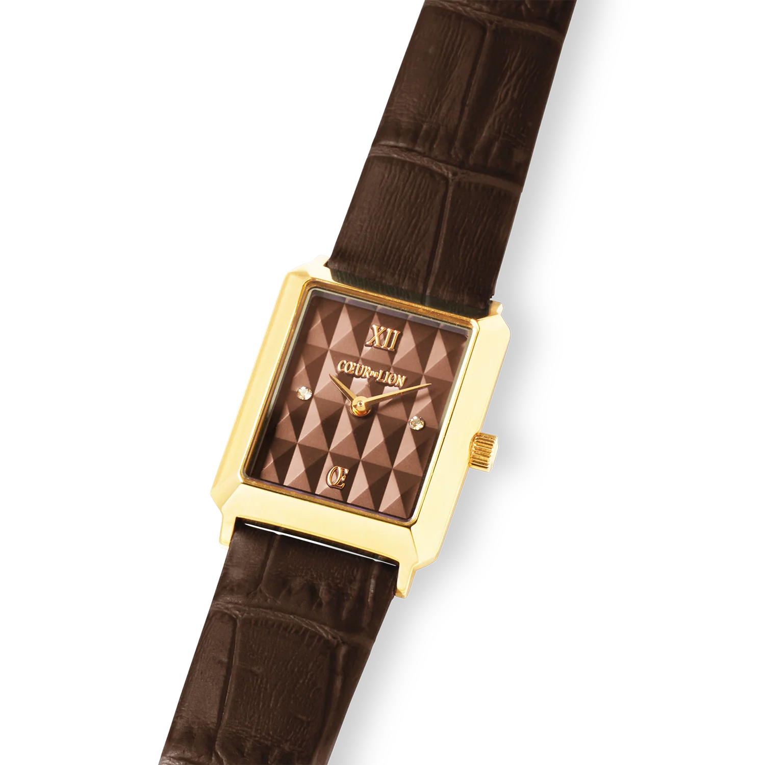 Dit horloge is perfect voor vrouwen die van elegantie houden en tegelijkertijd een neusje voor trends hebben. De geometrisch vormgegeven wijzerplaat in warme mokkamousse vangt het licht vanuit elke hoek anders en wordt geaccentueerd door sprankelende zirkonia. Samen met de goudkleurige roestvrijstalen kast straalt het horloge tijdloze verfijning uit, terwijl de elegante nappaleren band in de trendy kleur mokka een vleugje moderne natuurlijkheid toevoegt. Of het nu voor zaken is, een diner of als discreet hoogtepunt in het dagelijks leven - dit model is de perfecte metgezel voor stijlbewuste vrouwen die understatement willen combineren met luxe.