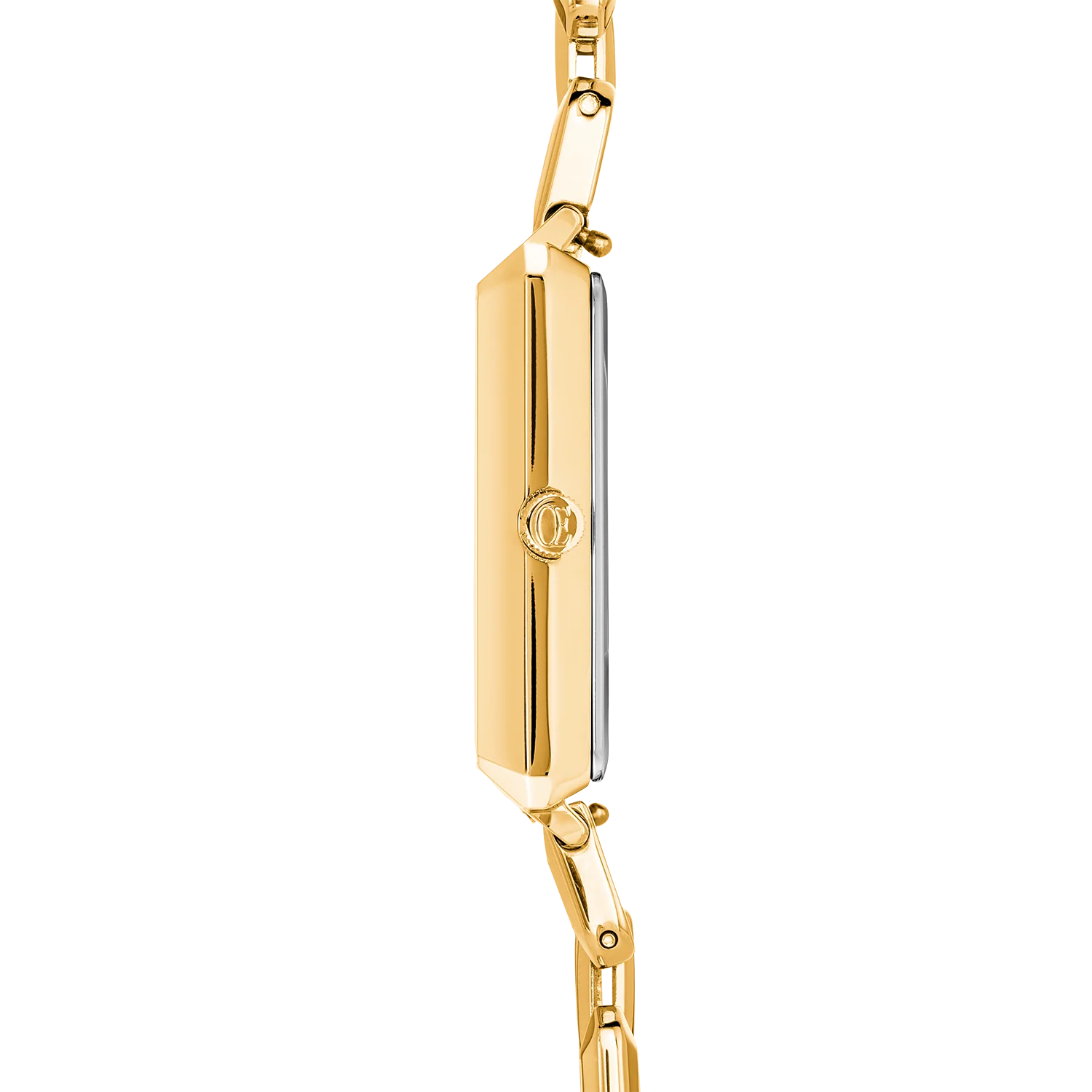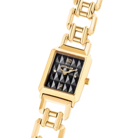 Dit horloge is een statement voor iedereen die van krachtige elegantie houdt. De diepzwarte, geometrisch gestructureerde wijzerplaat met sprankelende zirkonia is zowel modern als luxueus, terwijl de glanzende gouden roestvrijstalen band met opvallende schakels een expressief silhouet creëert. Een accessoire dat perfect past bij feestelijke outfits, maar ook glamour toevoegt aan dagelijks gebruik - ideaal voor vrouwen die hun gevoel voor stijl met elk detail willen tonen.