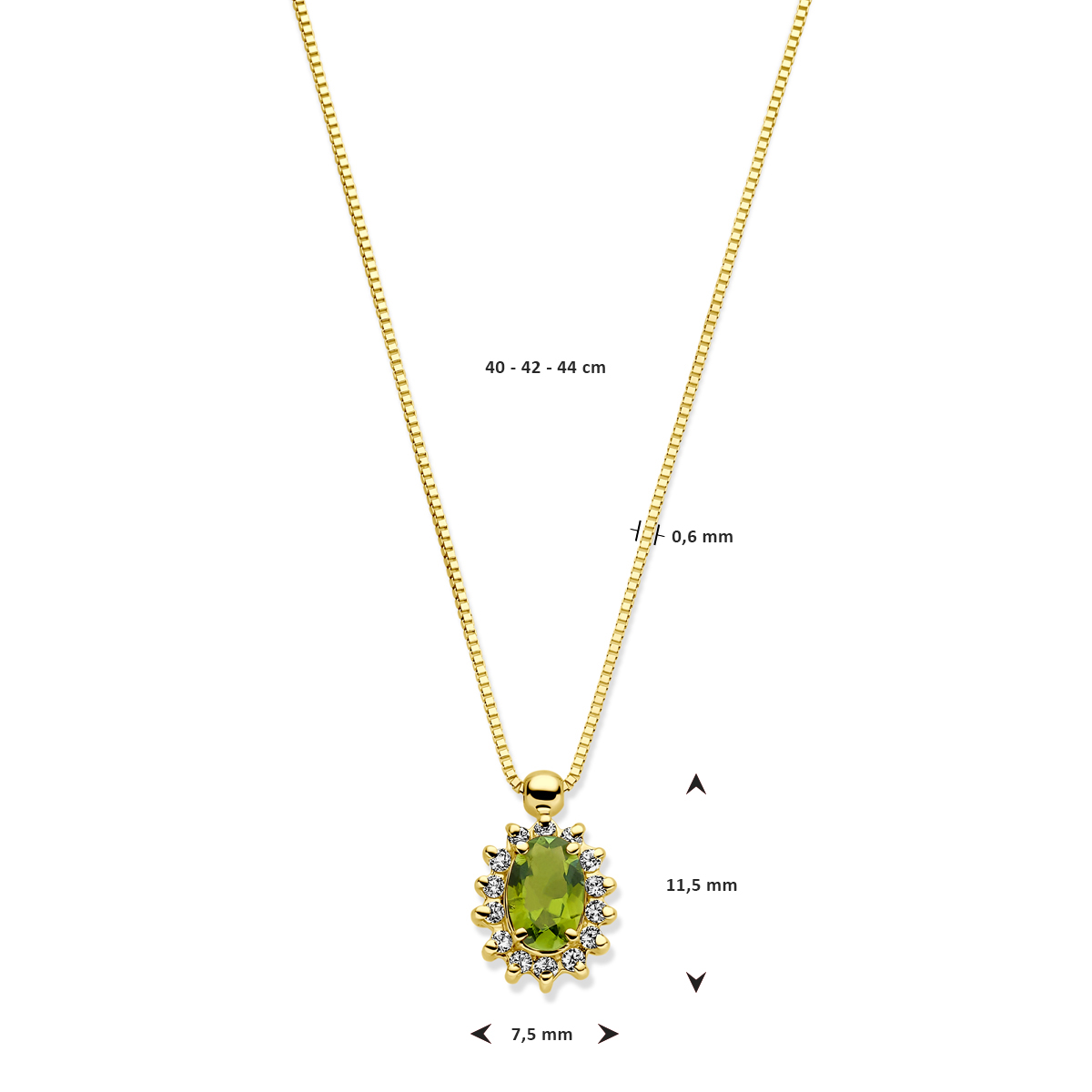 14k Geelgouden venetiaan collier met halo hanger, met toermalijn en diamant. Het collier heeft een draaglengtes van 40,42 en 44cm en is uitgevoerd met karabijnsluiting. Het diamantgewicht is 0.11ct. De schakelbreedte is 0.6mm.