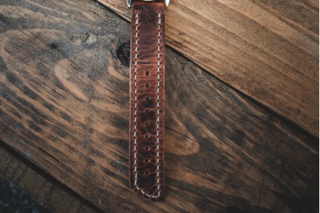Deze band is een onbewerkte lederen band en het hoort bij het karakter van het horloge dat deze band lichte en donkere strepen, groeven en ruwe randen ontwikkeld bij normaal dagelijks gebruik. Op de tweede foto ziet u een voorbeeld van hoe de band zich kan ontwikkelen.