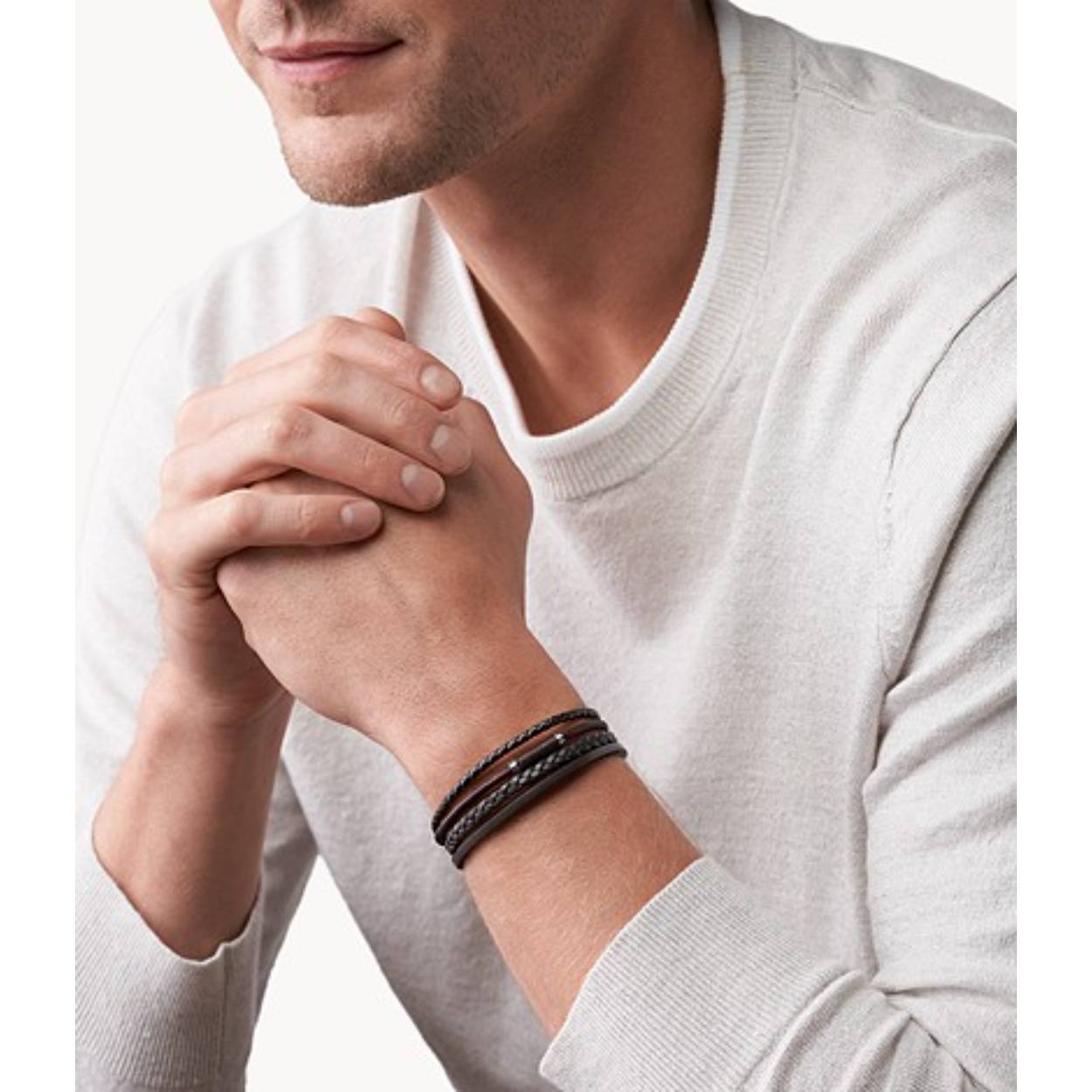Deze multilook armband van Fossil heeft vier bruine leren banden.
