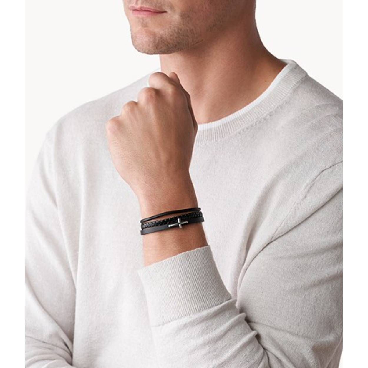 Deze multilook armband van Fossil heeft 3 zwarte leren banden