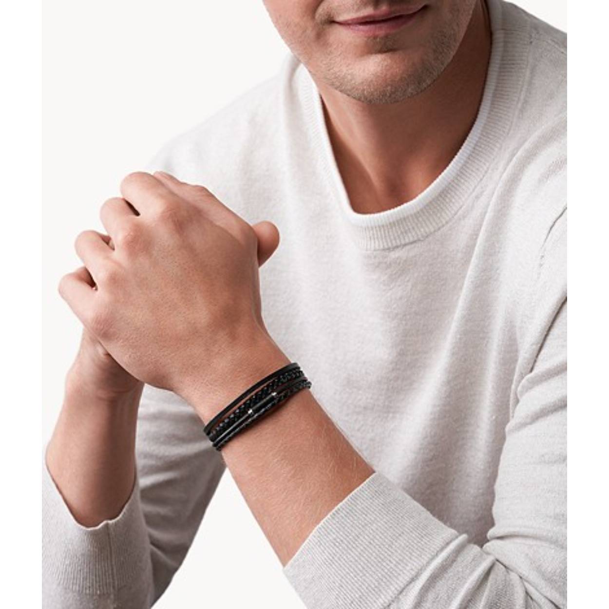 Deze multilook armband van Fossil heeft vier zwarte leren banden