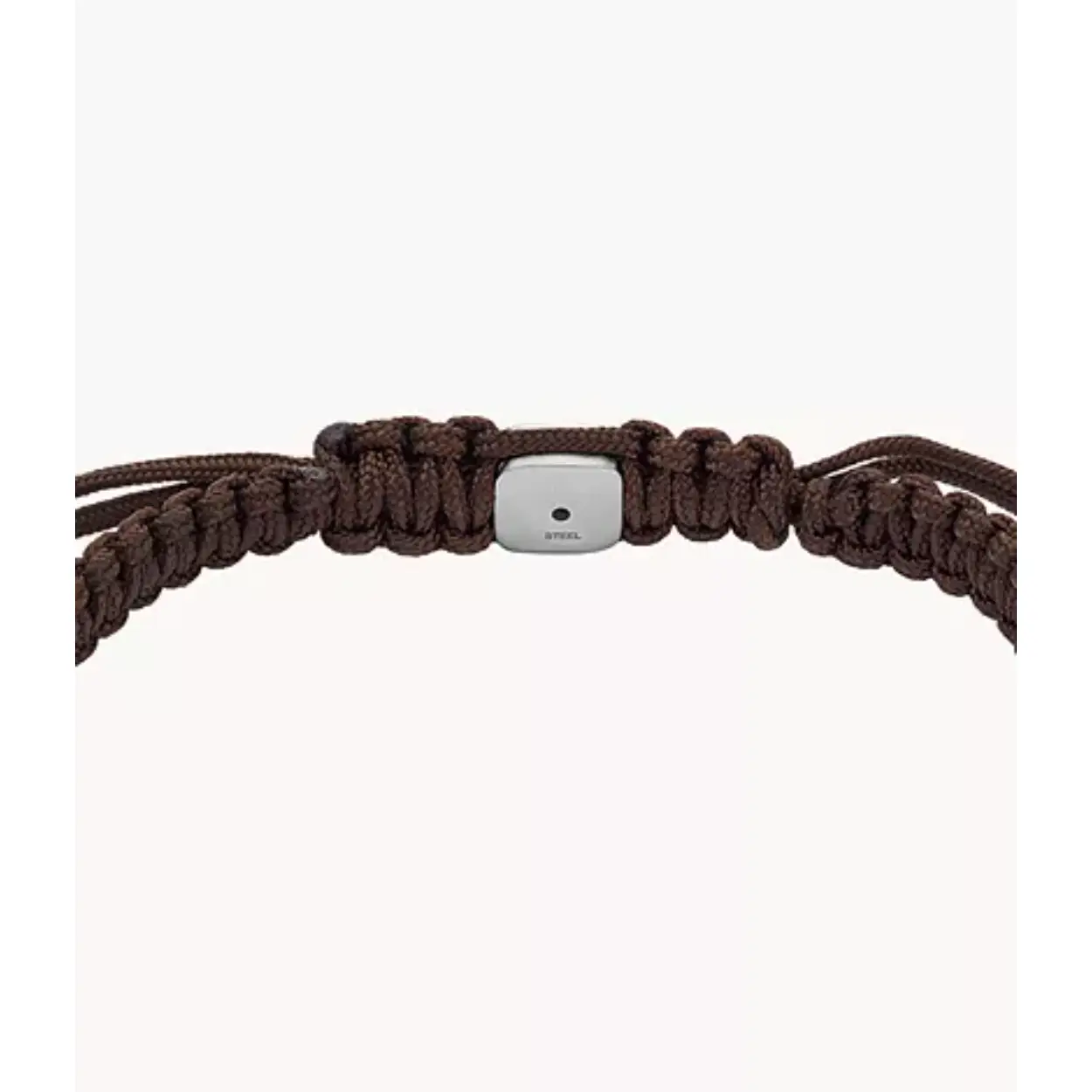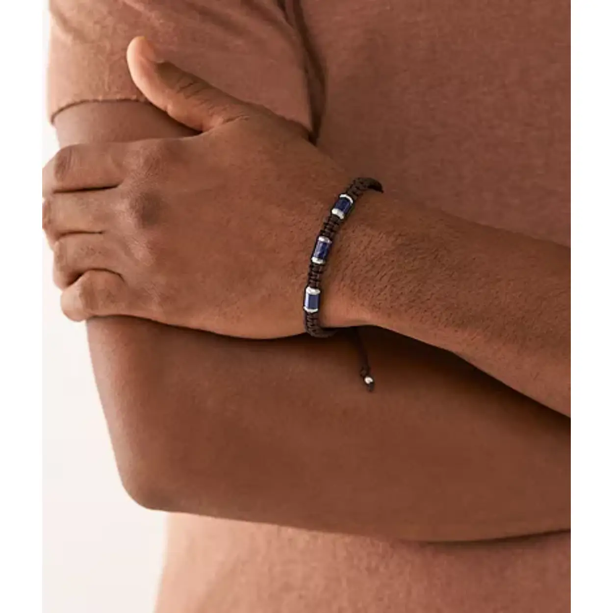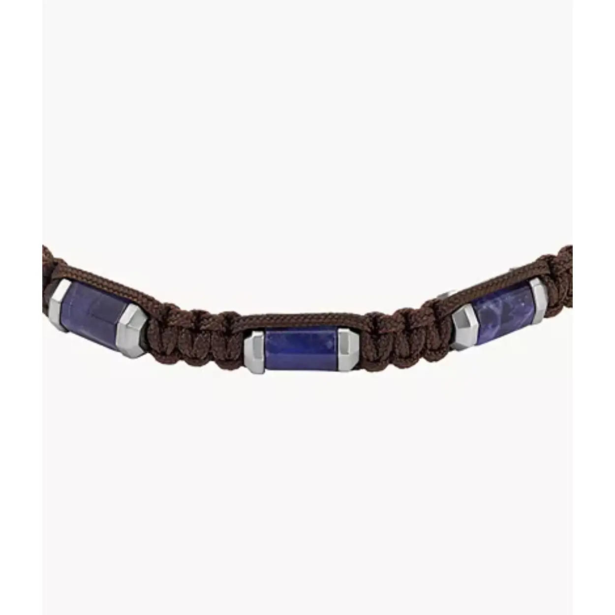 Bruine nylon cobra stitch armband met sodaliet kralen en stalen accenten.